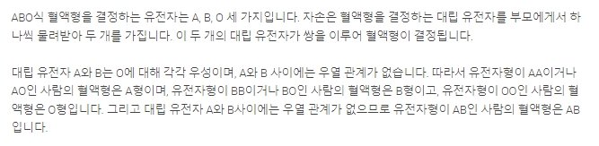 7. aa와 ao의 조합에서는 O가 열성 유전자여서 일반적으로 오직 A형이 나타납니다.