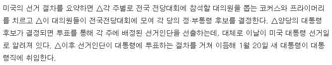다음백과에 정리된 내용을 보면, 미국 대통령 선거는 단순히 투표로만 결정되는 것이 아닙니다. 대선은 보통 3단계로 나뉘며, 정당 내 후보 선출, 일반 유권자 투표, 그리고 선거인단 투표로 이어집니다. 특히 미국은 선거인단 제도를 사용하기 때문에, 특정 주의 선거 결과가 전체 대선에 큰 영향을 미칠 수 있다는 점이 독특합니다. 이런 부분 때문에 미국 선거가 복잡하다고 느껴질 수도 있습니다.