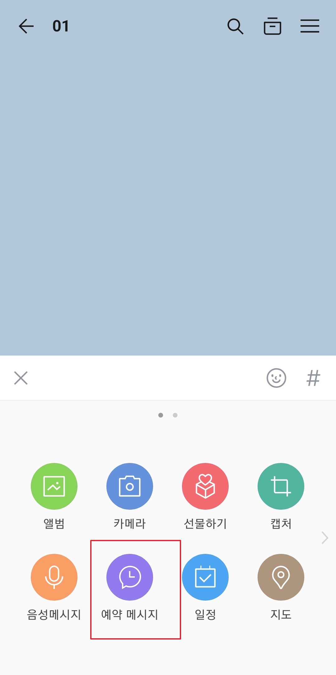 2. 선택한 채팅방 안에서 화면 왼쪽 하단에 있는 + 버튼을 길게 확인해 보세요. 이 버튼은 사진, 동영상, 파일 전송뿐 아니라 다양한 부가 기능이 숨겨진 곳입니다. 누르면 메뉴가 펼쳐지는데, 그중에서 ‘예약 메시지’를 찾아 터치하면 예약 설정 화면으로 이동합니다.