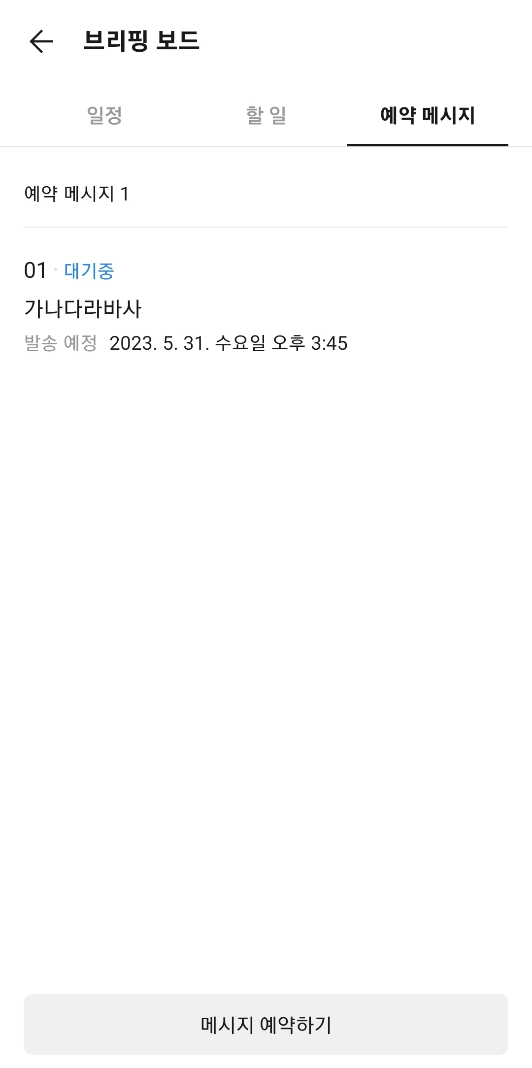 10. 예약한 메시지를 확인하거나 내용을 수정하고 싶을 때는 ‘예약 목록 보기’ 메뉴를 선택하세요. 여기에는 대기 중인 모든 예약 메시지가 목록으로 표시되어 날짜, 시간, 메시지 내용을 언제든지 확인하고 수정할 수 있습니다. 간혹 전송 직전 내용을 재확인할 때 유용합니다.