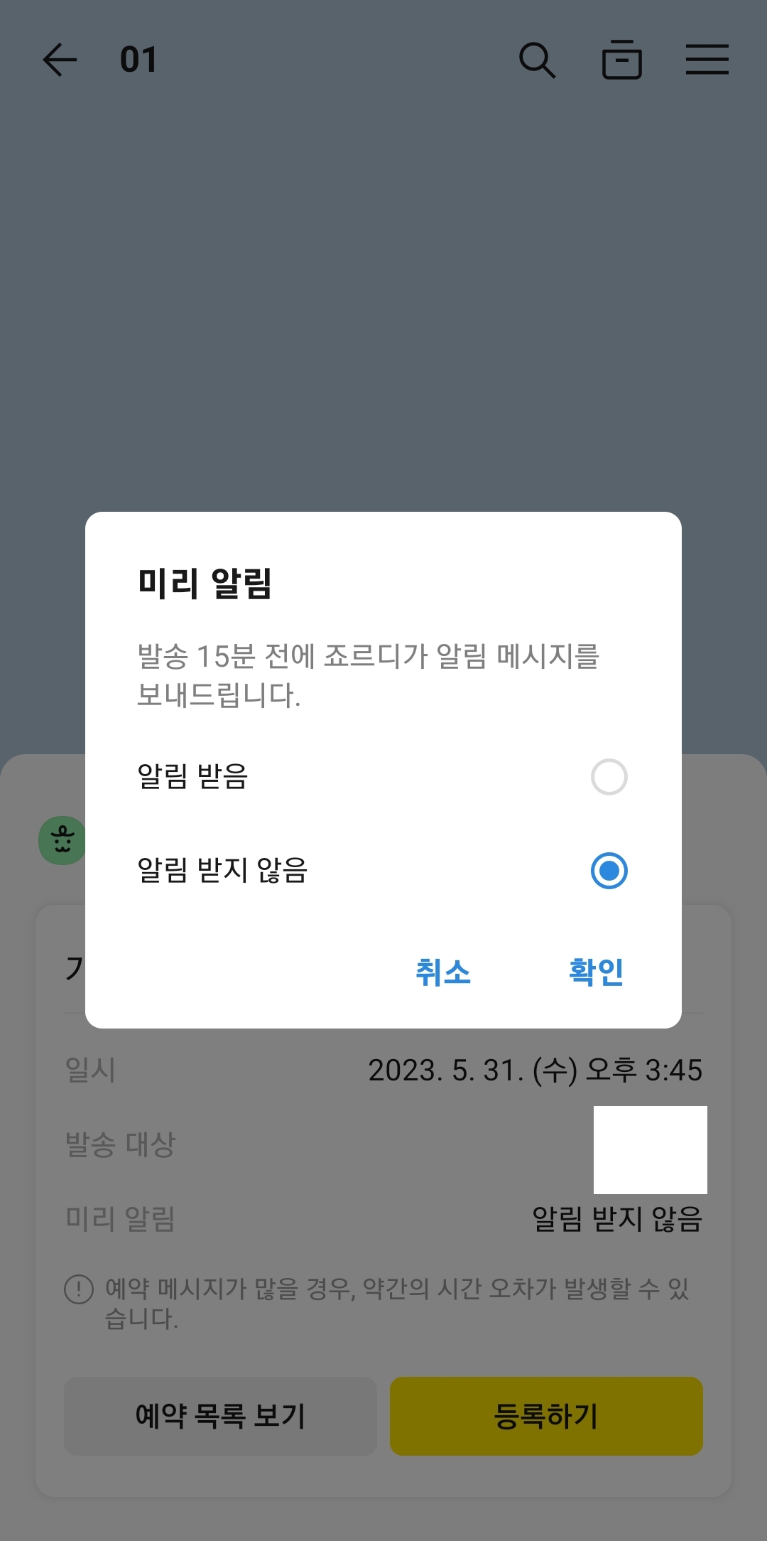 9. 모든 설정이 끝났다면 화면 하단의 ‘등록하기’ 버튼을 눌러 예약을 확정합니다. 버튼을 누르면 작은 팝업 창이 잠시 나타나며 ‘예약 완료’ 표시가 보입니다. 이 창이 금세 사라지니 잘 보이지 않을 경우 예약 목록에서 정상 등록 여부를 다시 확인할 수 있습니다.