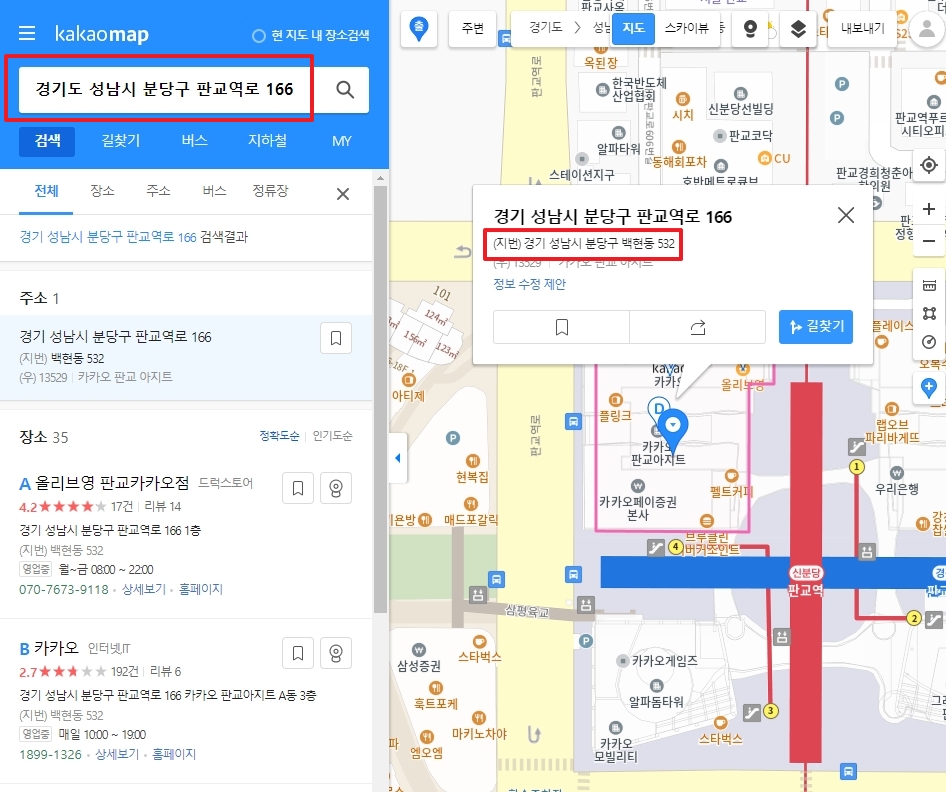 검색 결과 화면에서는 입력했던 정보 옆에 작은 '(지번)' 문구가 보이며, 해당 부분을 통해 이용자는 변환된 지번주소를 쉽게 확인할 수 있습니다. 실제로 '경기도 성남시 분당구 판교역로 166'를 입력했을 때는 '경기 성남시 분당구 백현동 532'와 같이 정확한 지번 주소가 실시간으로 표시되어 주소 선택과 복사가 간편해집니다.