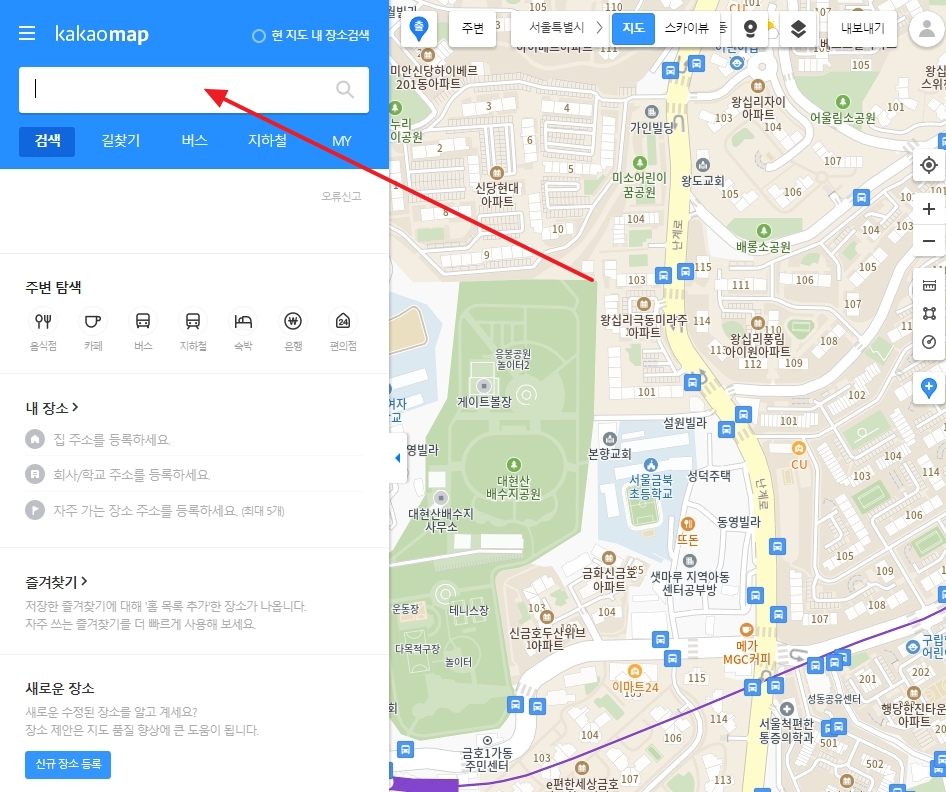이 화면은 카카오맵을 실행했을 때 처음 나오는 메인 페이지입니다. 상단 중앙에 위치한 검색창이 강조되어 있으며, 이용자는 이곳에 도로명주소나 지번주소를 입력하여 다양한 위치 정보를 빠르고 정확하게 찾을 수 있도록 도와줍니다. 깔끔한 인터페이스로 누구나 손쉽게 주소를 검색할 수 있습니다.