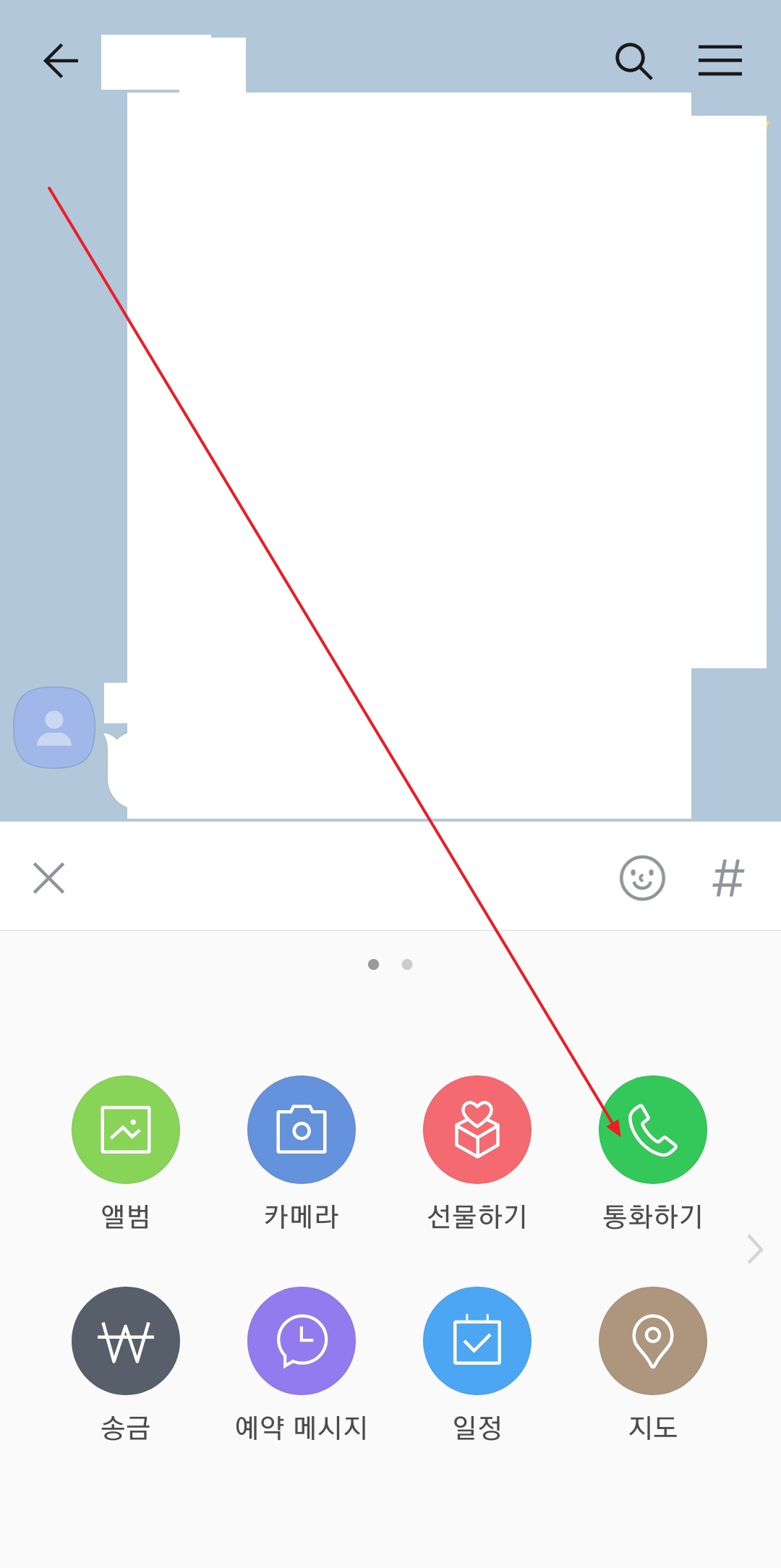 3. 채팅창에서도 페이스톡을 걸 수 있어요. 채팅창 하단의 + 버튼을 눌러 옵션 메뉴를 연 뒤, '통화하기'를 선택하면 작은 팝업이 뜹니다. 여기서 페이스톡 아이콘을 고르면 곧바로 영상 통화가 시작되고, 네트워크 상태가 좋으면 지연 없이 대화할 수 있습니다.