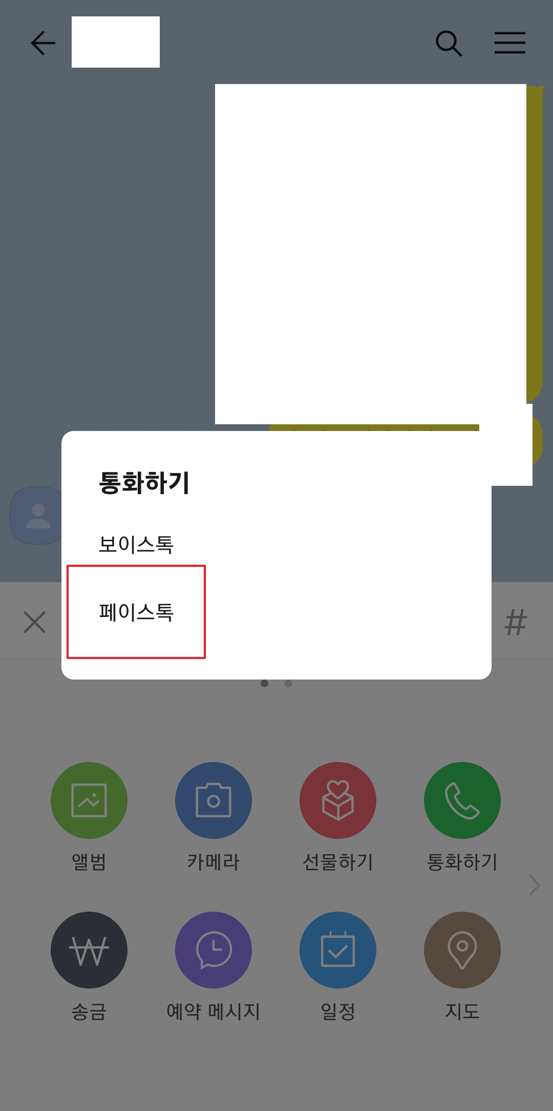 4. 팝업에서 '통화하기' 버튼을 누르면 작은 메뉴창이 나타나고, 여기서 페이스톡을 선택하면 즉시 연결됩니다. 이렇게 하면 채팅을 닫지 않고도 빠르게 영상 통화를 걸 수 있어서 매우 편리하고, 중요한 순간에도 놓치지 않고 대화할 수 있습니다.