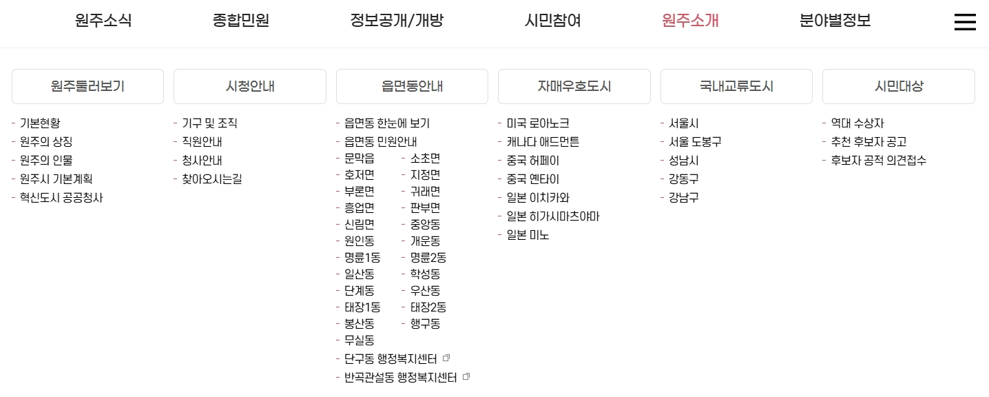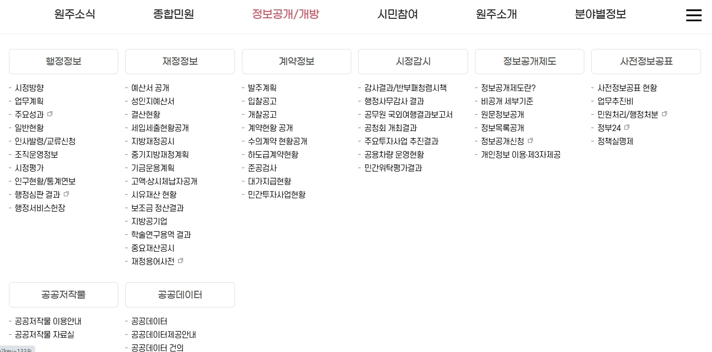 정보공개/개방 메뉴는 원주시가 시 살림을 어떻게 꾸려나가는지 투명하게 보여주는 곳이에요. 우리 세금이 어디에 어떻게 쓰이는지 알 수 있도록 예산을 공개하고, 계약은 어떻게 이루어지는지도 다 나와있습니다. 이런 정보들을 시민들이 언제든지 들여다볼 수 있게 해서, 시 행정이 얼마나 투명하게 운영되는지 직접 확인할 수 있게 해준다는 점에서 아주 중요한 부분이라고 할 수 있어요.