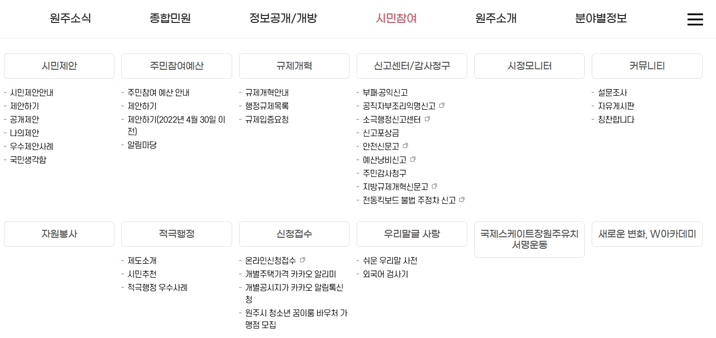 시민참여 메뉴를 통해서는 원주 시민이라면 누구나 직접 시정에 목소리를 낼 수 있습니다. 좋은 아이디어가 있으면 제안할 수도 있고, 예산을 어디에 썼으면 좋겠는지 의견을 낼 수도 있어요. 불편한 점이 있다면 신고하거나 감사를 청구할 수도 있고요, 자유게시판이나 설문조사처럼 여러가지 방법으로 참여할 수 있어서 우리 동네를 더 좋은 곳으로 만드는 데 힘을 보탤 수 있답니다.