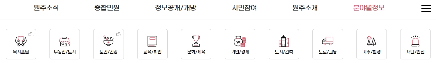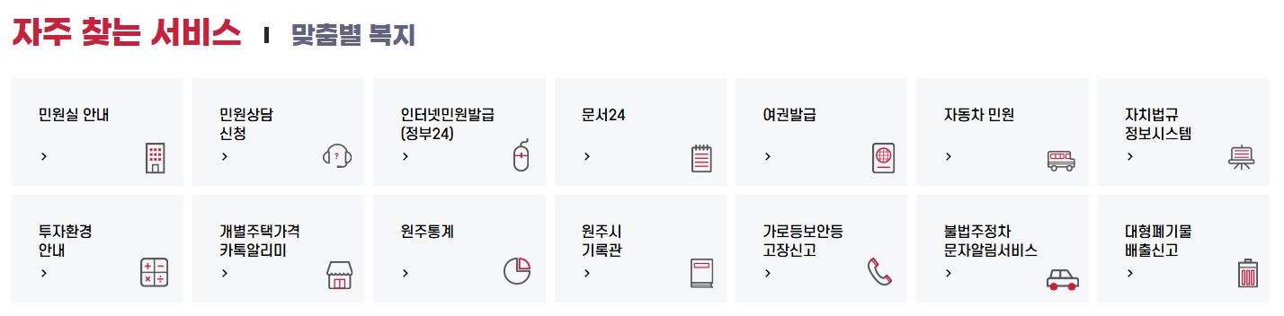 원주시청 홈페이지에 들어가시면 시의 최신 소식이나 공지사항은 물론이고, 종합민원, 정보공개, 시민참여 같은 여러가지 행정 정보를 쉽게 찾아볼 수 있습니다. 복지나 교통, 취업 정보 같이 생활에 꼭 필요한 내용들도 분야별로 잘 정리되어 있어서 아주 편리해요.