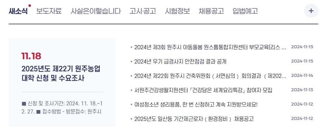 홈페이지에 들어가면 위쪽에 새소식이라는 곳이 있는데요, 여기서는 원주시의 가장 새로운 정보들을 모아서 보여줘요. 그냥 공지뿐만 아니라 다른 기관 소식, 재미있는 문화행사, 우리 동네 소식 같은 것들도 다 알려주거든요. 예를 들면 원주농업 대학 학생 모집 같은 중요한 공고가 떠서 시민들이 중요한 정보를 놓치지 않고 바로바로 확인할 수 있게 도와줍니다.