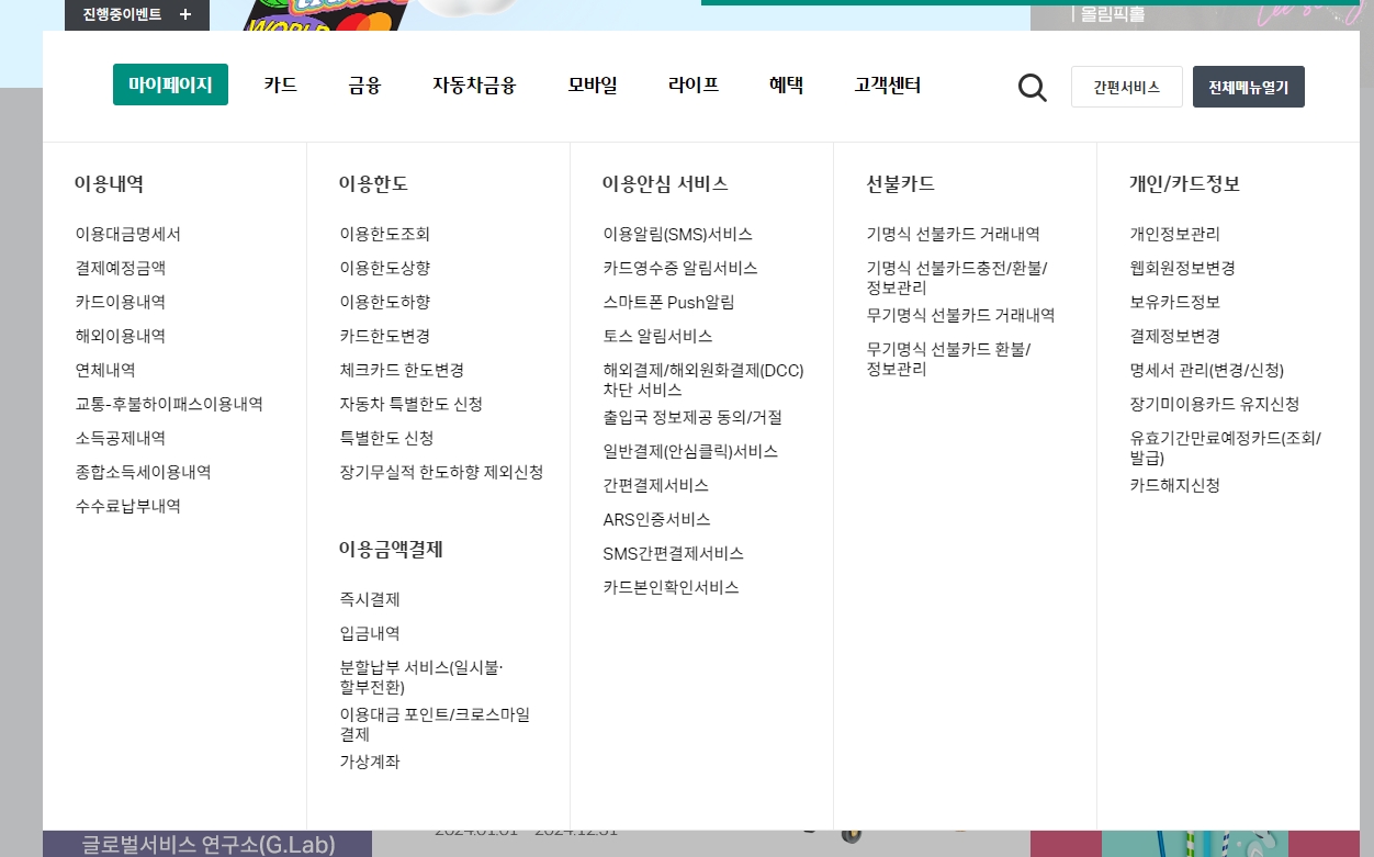 홈페이지 위쪽에 있는 마이페이지 메뉴를 눌러보면 내가 카드를 사용한 여러 내역들을 아주 자세하게 볼 수 있어요. 이번 달에 내야 할 카드값 명세서나 다음 달에 나갈 예정인 금액, 카드 쓴 내역, 외국에서 쓴 내역, 혹시나 연체된 내역이 있는지도 다 나옵니다. 그리고 교통카드나 하이패스로 쓴 내역, 연말정산을 위한 소득공제 내역까지도 한 번에 확인할 수 있답니다.