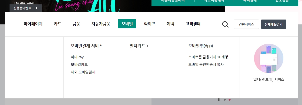 모바일 메뉴에서는 스마트폰으로 결제하는 것과 관련된 여러 정보들을 볼 수 있습니다. 하나Pay(페이), 모바일카드, 외국에서 스마트폰으로 결제하는 방법, 멀티카드 같은 편리한 기능들을 어떻게 쓰는지 알 수 있어요.