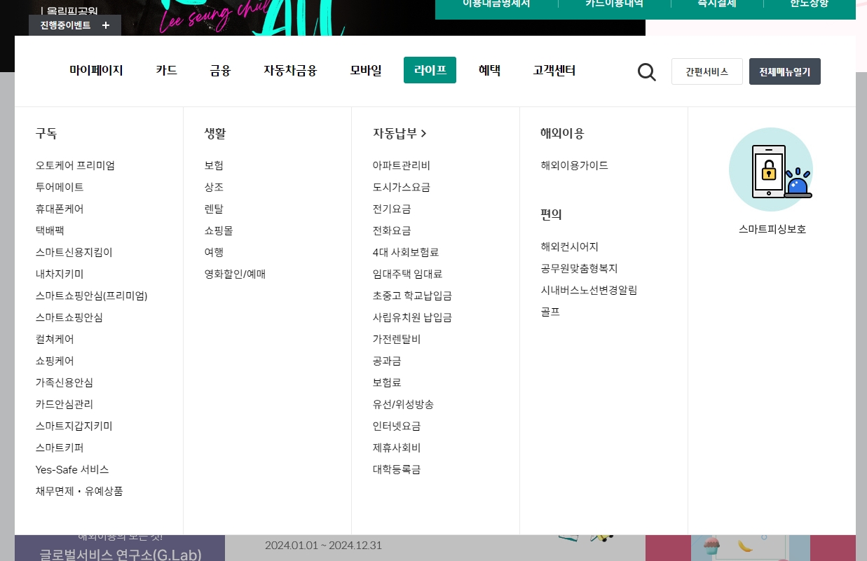 라이프 메뉴는 이름처럼 우리 생활과 관련된 여러 가지 편리한 기능들을 모아놓은 곳이에요. 매달 돈을 내고 이용하는 구독 서비스와 생활에 도움이 되는 서비스들을 제공하는데요. 오토케어 프리미엄, 투어메이트, 휴대폰케어 같은 구독 서비스와 상조, 렌탈, 쇼핑몰, 여행, 영화 할인 예매 같은 생활 서비스를 이용할 수 있습니다. 정말 편리한 기능 중 하나는 자동 납부 기능인데, 이걸 이용하면 아파트 관리비나 도시가스 요금, 전기 요금 같은 여러 가지 공과금을 매달 알아서 내주니까 잊어버릴 걱정이 없어요.