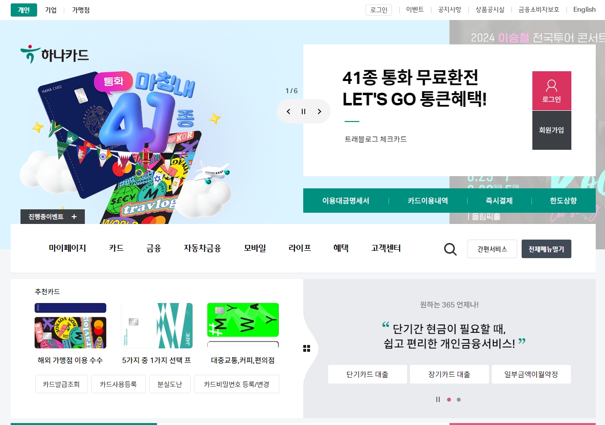 가장 먼저, 하나카드 홈페이지로 들어가시면 여러가지 금융 관련 일들을 쉽게 처리할 수 있어서 정말 편해요. 카드 상품 정보부터 시작해서 내가 어디에 얼마나 썼는지 사용 내역을 조회하는 것, 새로운 카드를 신청하는 것, 그리고 포인트몰이나 가맹점 정보, 할인 혜택 안내까지 전부 다 확인할 수 있습니다. 홈페이지 첫 화면을 보시면 위쪽에는 개인, 기업, 가맹점 메뉴가 있고, 가운데에는 여러 카드 상품과 좋은 혜택들을 알려주는 광고판 같은 게 보여요.