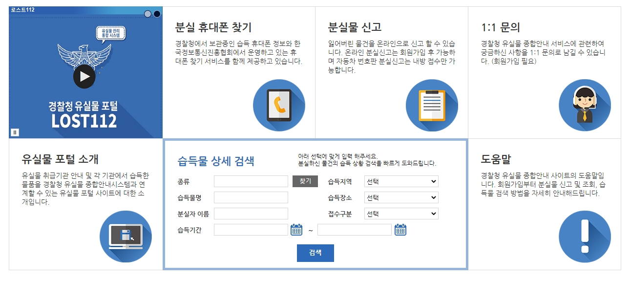 이 홈페이지도 전체적인 구조는 비슷한데요. 혹시라도 내가 잃어버린 물건이 지하철 분실물센터가 아니라 이쪽, 그러니까 경찰청 유실물센터 쪽에 등록되어 있을 수도 있으니까요.