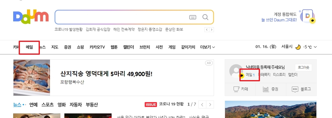 로그인을 성공적으로 마치셨다면 화면이 바뀔 거에요. 바뀐 화면에서 왼쪽 위를 잘 찾아보시면 '메일'이라고 적힌 글씨가 보일 겁니다. 또는 원래 로그인 버튼이 있던 자리 근처에 '메일'이라고 표시되기도 해요. 어느 쪽이든 상관없이 '메일'이라고 쓰여진 부분을 찾아서 눌러주면 내 메일함으로 들어갈 수 있습니다.