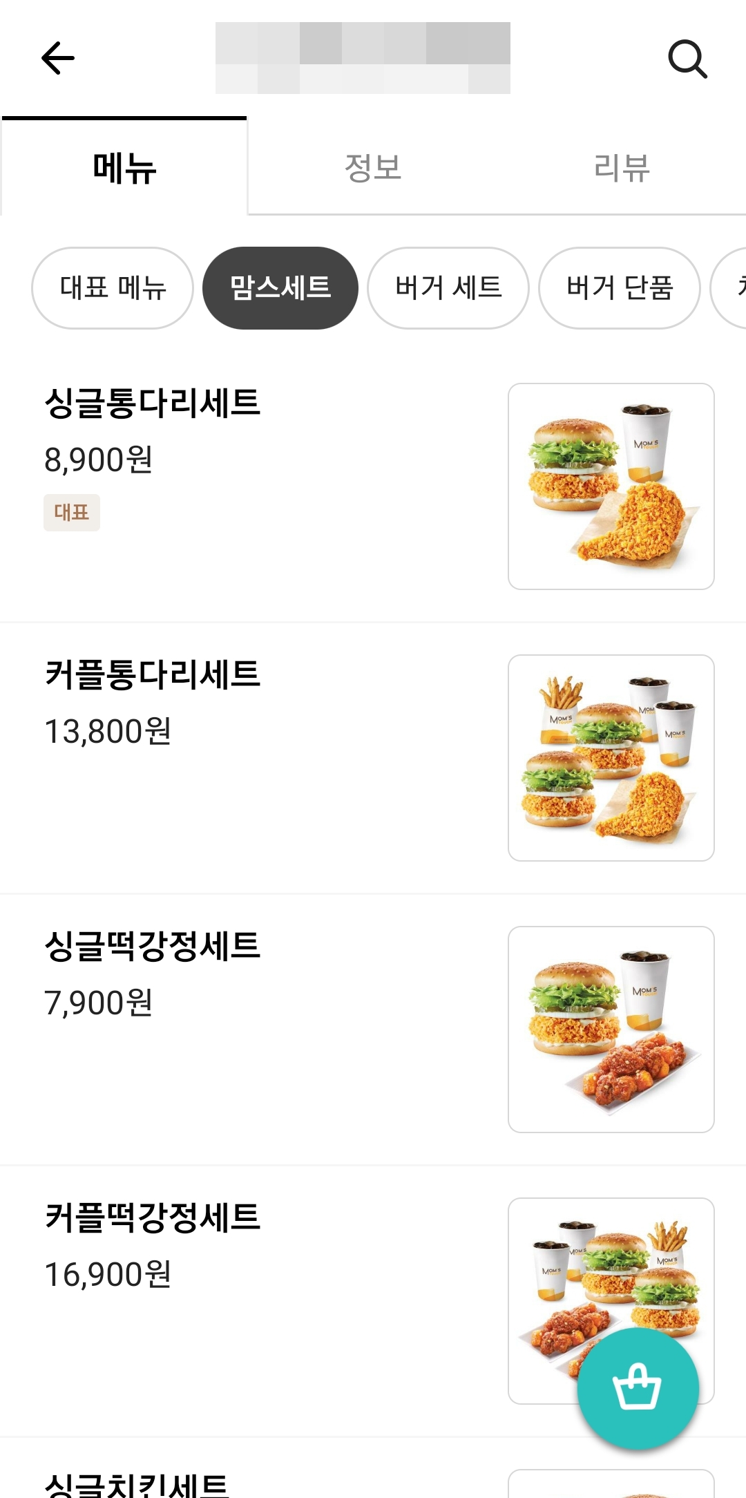 먼저 맘스터치 메뉴 가격에서 세트 메뉴를 살펴볼 수 있는데요. 보통 버거 세트만 생각하기 쉽지만, 치킨이나 떡강정이 포함된 맘스세트도 있습니다. 싱글통다리세트, 커플통다리세트, 싱글떡강정세트, 커플떡강정세트, 싱글치킨세트, 커플치킨세트 등으로 구성되어 있어서 인원수에 맞게 주문하기 편리하게 되어있어요. 혼자서 푸짐하게 먹고 싶을 때나 둘이서 버거 외에 다른 메뉴도 함께 즐기고 싶을 때 좋은 선택이 될 것 같습니다.