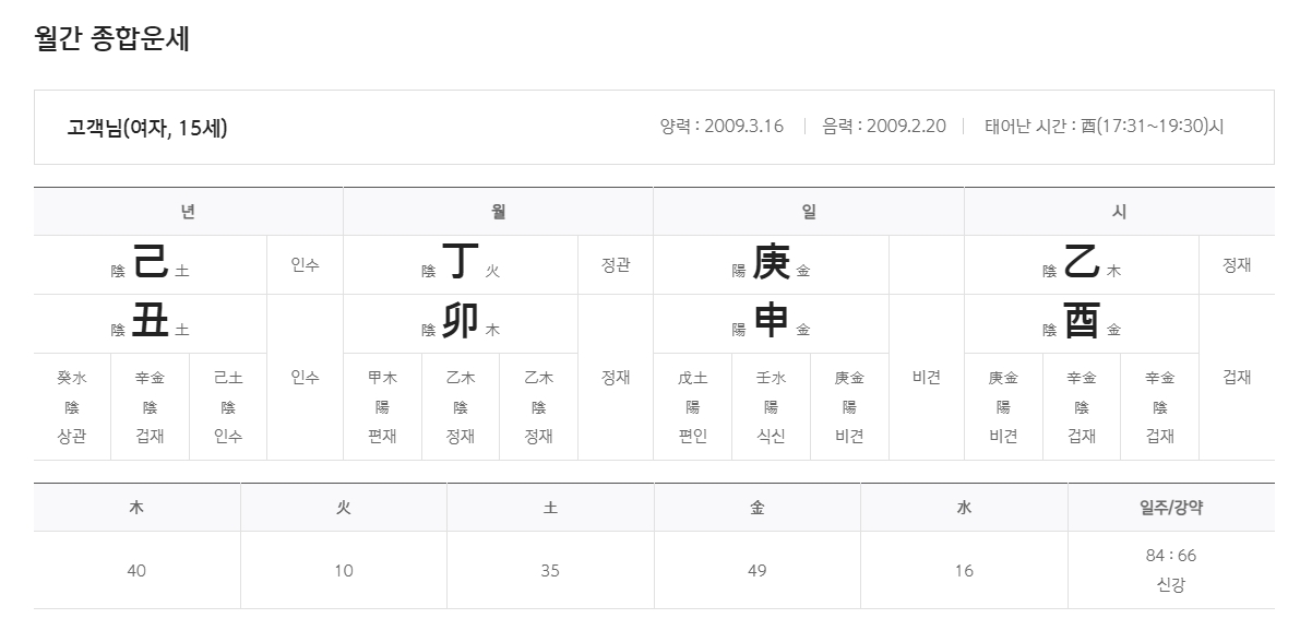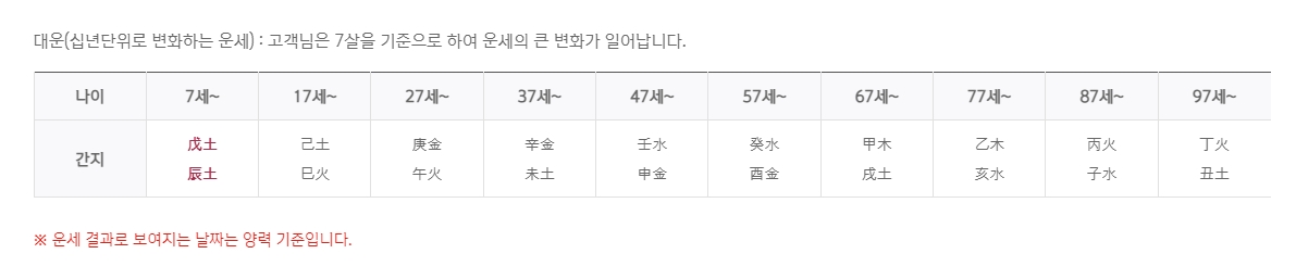 정보를 모두 입력하고 '운세보기'를 누르면 결과가 나옵니다. 가장 먼저 한자로 가득한 어려운 표가 보일 수 있는데, 이것이 바로 나의 사주팔자를 나타내는 표입니다. 한자를 잘 모르거나 명리학 공부를 하지 않았다면 봐도 이해하기가 어렵기 때문에 이 부분은 가볍게 지나치셔도 괜찮습니다. 진짜 중요한 내용은 바로 아래부터 시작되니까요.