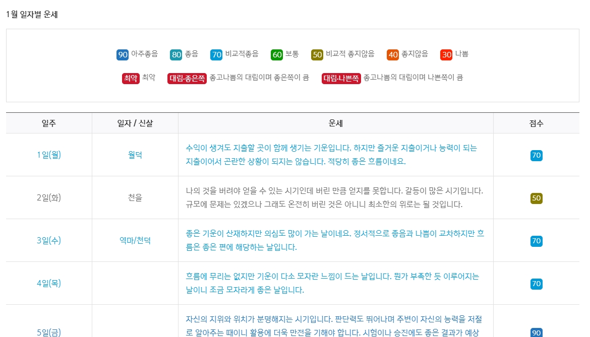 바로 해당 월의 모든 날짜별 운세를 하나하나 알려준다는 점이었습니다. 예를 들어 1월 운세를 본다면, 1월 1일부터 31일까지 하루하루의 운세를 달력 형태로 보여줍니다. 각 날짜마다 운세 점수까지 매겨져 있어서 어느 날 운이 좋고 어느 날 조심해야 할지 한눈에 파악하기가 정말 쉽습니다. 무료 서비스인데 이렇게까지 자세하게 알려준다는 점이 아주 인상 깊었습니다.