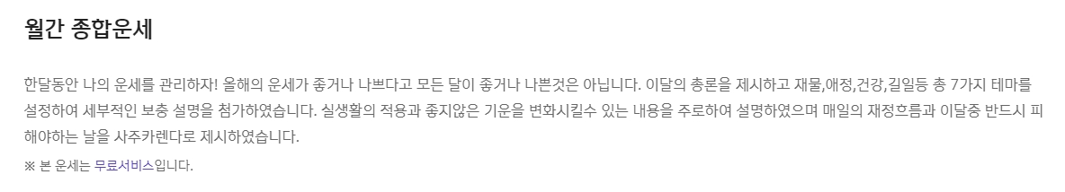 여러가지 메뉴 중에서 '월간종합운세'를 눌러보면, 한 달 동안의 운세를 종합적으로 알려주는 페이지가 나옵니다. 단순히 '이번 달은 운이 좋다, 나쁘다' 정도로 끝나는 것이 아니라, 돈과 관련된 재물운, 연애와 관련된 애정운, 그리고 건강운과 좋은 날짜를 알려주는 길일 정보까지 아주 세세하게 나누어서 설명해줍니다.