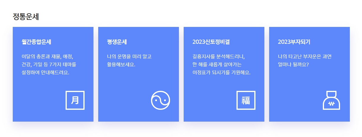 운세/사주 페이지로 들어오면 정말 다양한 종류의 운세 풀이가 준비되어 있는 것을 볼 수 있습니다. 한달의 운세를 알려주는 월간종합운세부터 시작해서, 한 사람의 인생 전체를 다루는 평생운세, 그리고 매년 초에 꼭 보게 되는 신토정비결까지 모두 무료로 볼 수 있습니다. 사진에는 작년 기준으로 나와있지만, 실제로 들어가보시면 올해의 내용으로 모두 새로 업데이트 되어 있으니 걱정하지 않으셔도 됩니다.