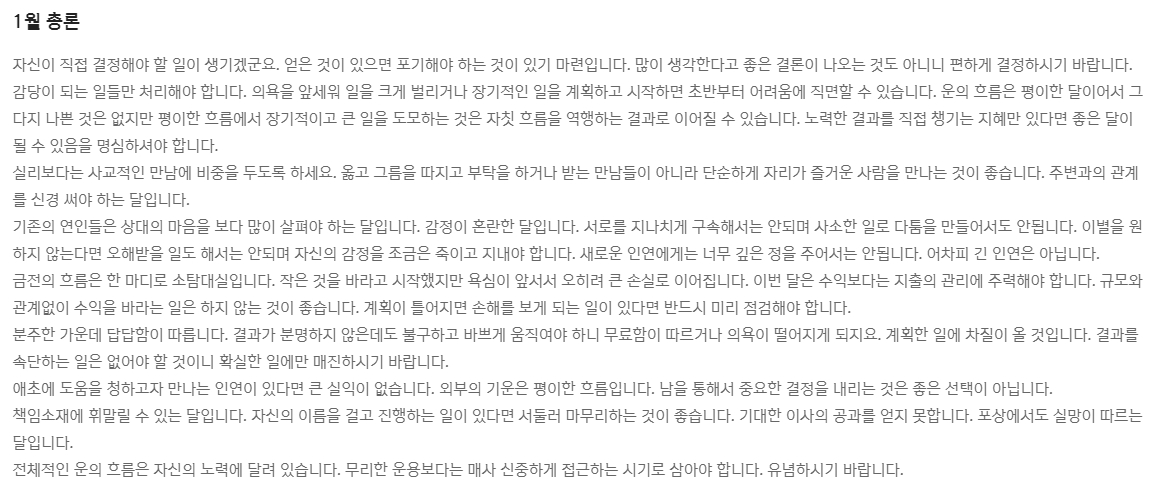 살면서 도움이 될 만한 현실적인 조언들을 많이 해주기 때문에, 그냥 재미로 보는 것을 넘어서서 실제로 한 달을 계획하는 데 큰 도움을 받을 수 있습니다. 안 좋은 기운이 있다면 어떻게 바꿀 수 있는지도 알려주니 꼭 확인해보세요.