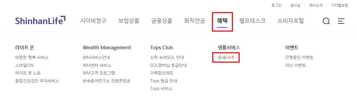 홈페이지에 들어가셨다면 이제 운세 메뉴를 찾아가야 합니다. 위쪽에 있는 여러 메뉴들 중에서 '혜택'이라는 글자를 찾아서 눌러주세요. 그러면 아래로 새로운 메뉴들이 보이는데, 그 중에서 '생활서비스'를 선택하면 오른쪽에 '운세/사주'라고 적힌 곳을 바로 찾으실 수 있을거에요. 여기를 클릭해서 들어가면 됩니다.