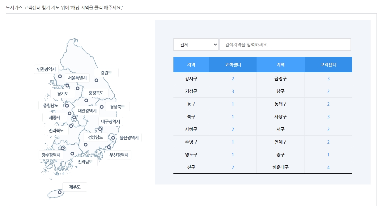 이 메뉴를 통해 전국 지도가 나타나며, 여기서부터 내가 사는 지역을 선택하는 과정이 시작됩니다. 가스 관련 민원이나 문의사항을 해결하기 위한 첫걸음이니 잘 따라와 주세요.