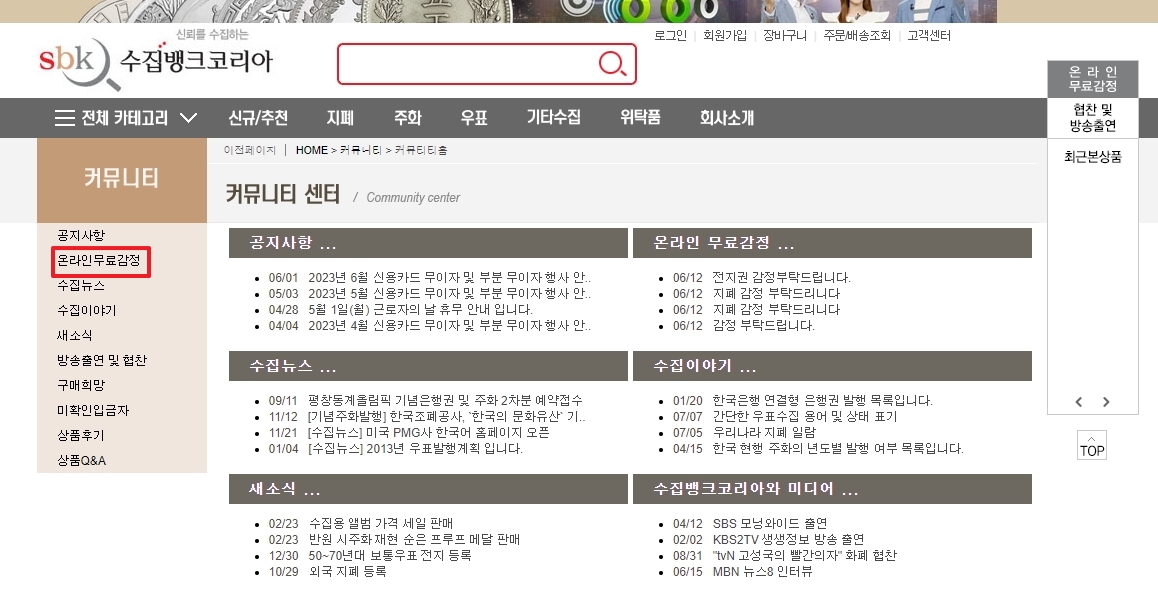 {"alt": "온라인 무료 감정 게시판으로 이동하는 과정"} 사용제 동전 가치 유의사항