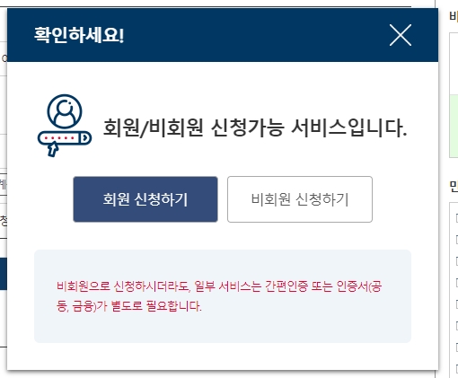 우리는 인터넷으로 진행할 것이므로, 우측에 보이는 '신청하기' 버튼을 누르면 됩니다. 회원가입이 되어 있지 않더라도 '비회원 신청하기' 기능으로도 충분히 이용 가능하답니다.