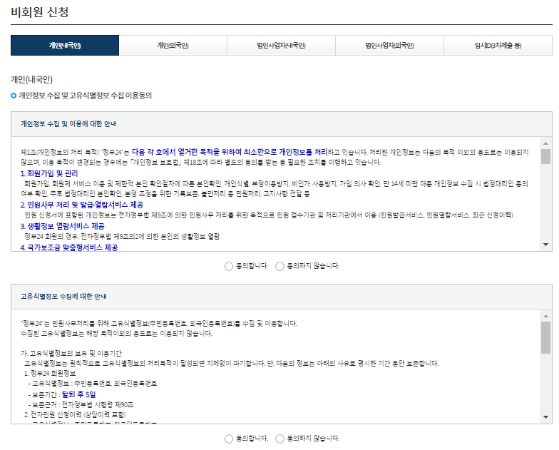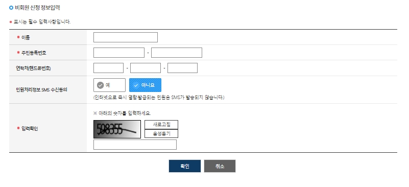 비회원으로 신청을 누르면 개인정보를 입력하는 화면이 나옵니다. 이름, 주민등록번호 등 필수 정보를 정확하게 기입하고 개인정보 수집 및 이용에 동의해야 합니다.
