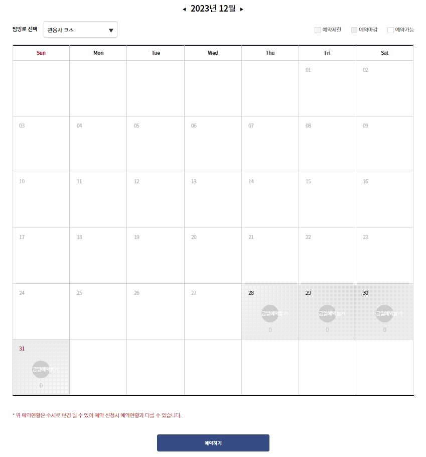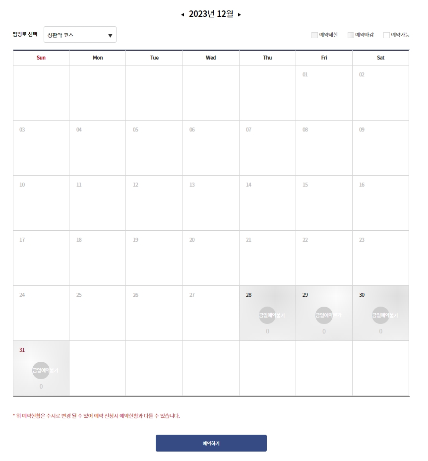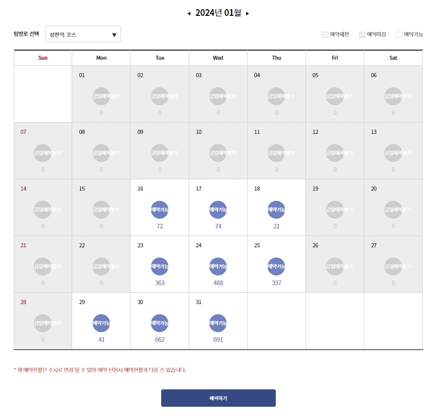 예약 페이지에 들어가면 가장 먼저 달력 형태로 된 예약 현황을 마주하게 됩니다. 여기서 원하는 날짜를 선택하여 예약 가능 인원이 남아있는지 확인할 수 있습니다. 주말이나 공휴일은 경쟁이 매우 치열하여 몇 주 전부터 마감되는 경우가 많습니다.