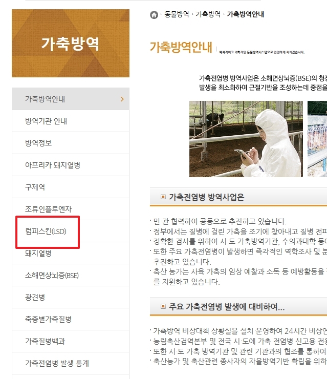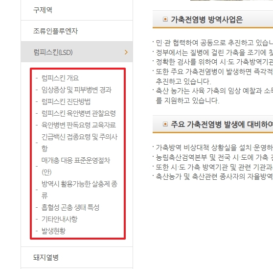 3. 페이지가 이동하면 좌측 메뉴에서 럼피스킨(LSD) 항목을 선택합니다. 이를 통해 럼피스킨병 관련 정보가 포함된 하위 메뉴가 열립니다. 여기에는 개요, 경과, 진단방법 등 럼피스킨병에 관한 다양한 정보를 확인할 수 있는 옵션이 포함되어 있습니다.