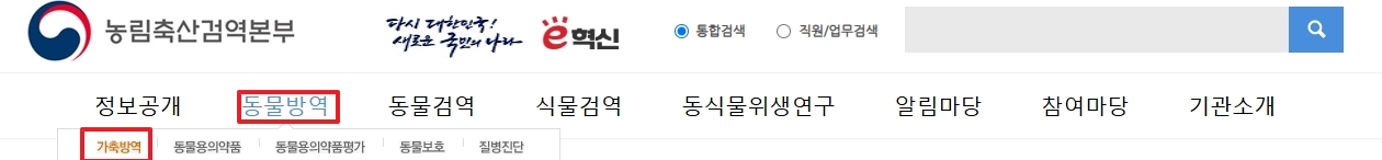 2. 상단 메뉴에서 동물방역 - 가축방역을 클릭하여 가축 방역 관련 정보로 이동합니다. 이 메뉴에서는 각종 가축 전염병에 관한 정보와 예방, 대처 방법 등이 상세히 안내되어 있습니다.