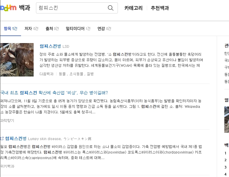 7. 다음백과 홈페이지에 접속하여 럼피스킨병을 검색합니다. 다음백과는 다양한 백과사전 자료를 제공하며, 럼피스킨병과 같은 가축 질병에 대한 기본 정보와 개요를 제공합니다. 이곳에서 질병의 정의, 전파 경로, 주요 증상 등을 확인할 수 있습니다.