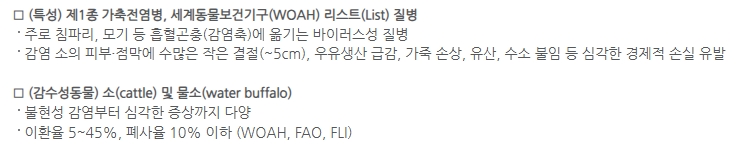 5. 럼피스킨병이 제1종 가축전염병으로 지정된 이유와 주요 증상들이 담긴 사진입니다. 감염된 가축의 피부에 생기는 작은 결절(약 5cm 크기), 유즙 생산 감소, 체중 감소, 가족 손실, 유산 등의 경제적 손실을 초래하는 주요 증상을 설명하고 있습니다. 이 질병은 소와 물소에게 치명적일 수 있으며, 폐사율은 약 10% 이하로 알려져 있습니다.