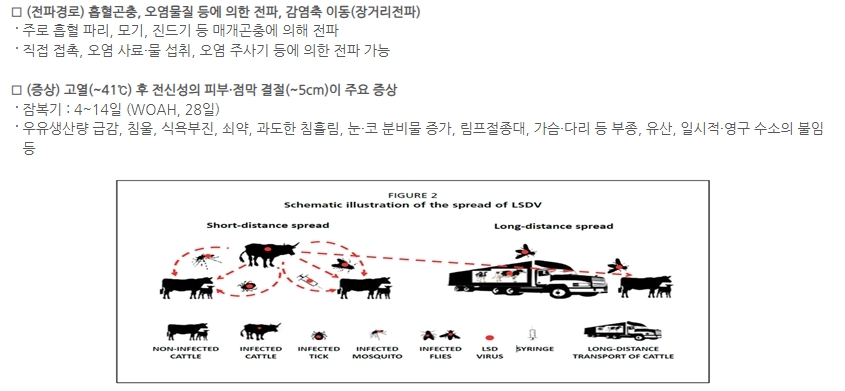 6. 럼피스킨병의 전파 경로와 매개체를 설명하는 다이어그램입니다. 주요 전파 경로는 흡혈 곤충(모기, 파리, 진드기)과 같은 매개체에 의한 전파이며, 감염된 가축과의 직접 접촉, 오염된 물질을 통한 장거리 이동 전파도 포함됩니다. 그림에서는 감염된 소와 매개 곤충을 통해 바이러스가 퍼지는 과정을 시각적으로 설명하고 있습니다.