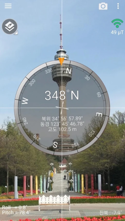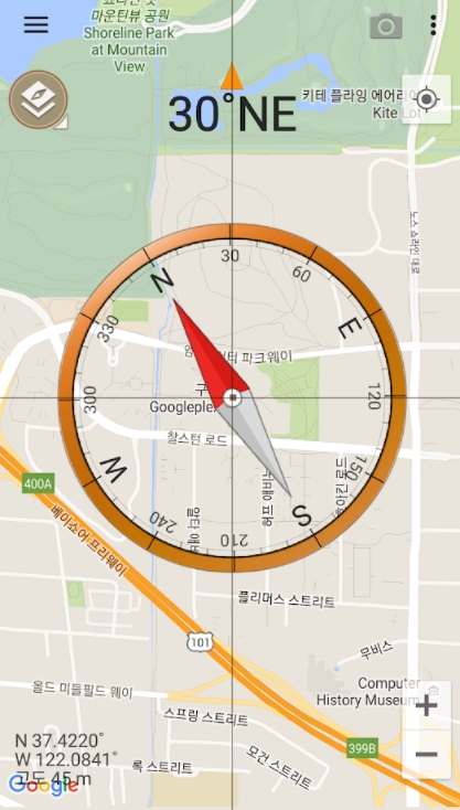또한, 구글 지도와 같은 지도 서비스 위에 나침반을 오버레이하는 기능도 제공됩니다. 지도 앱 자체에도 방향 표시 기능이 있지만, 이렇게 통합된 화면은 현재 나의 위치와 가야 할 방향을 동시에 직관적으로 파악하는 데 큰 도움을 줍니다.