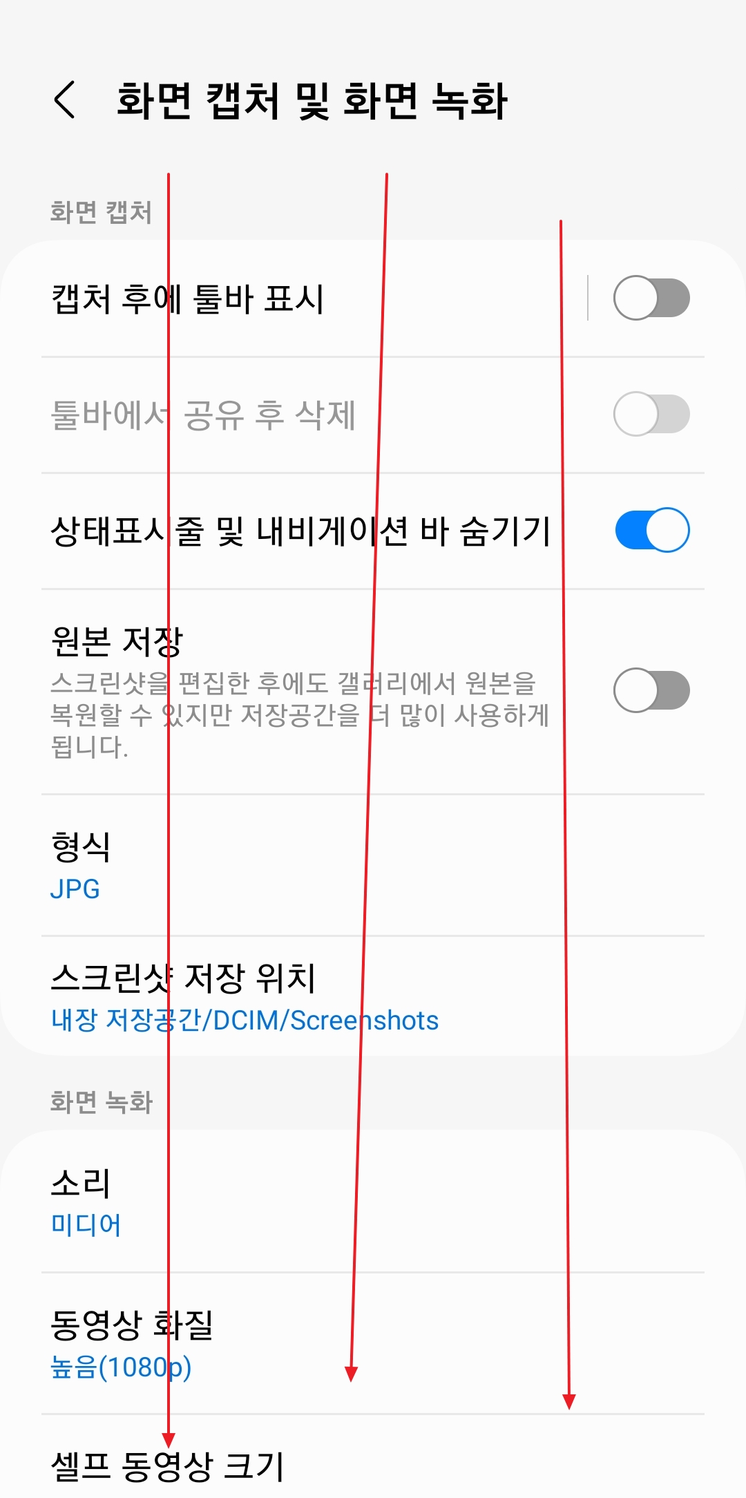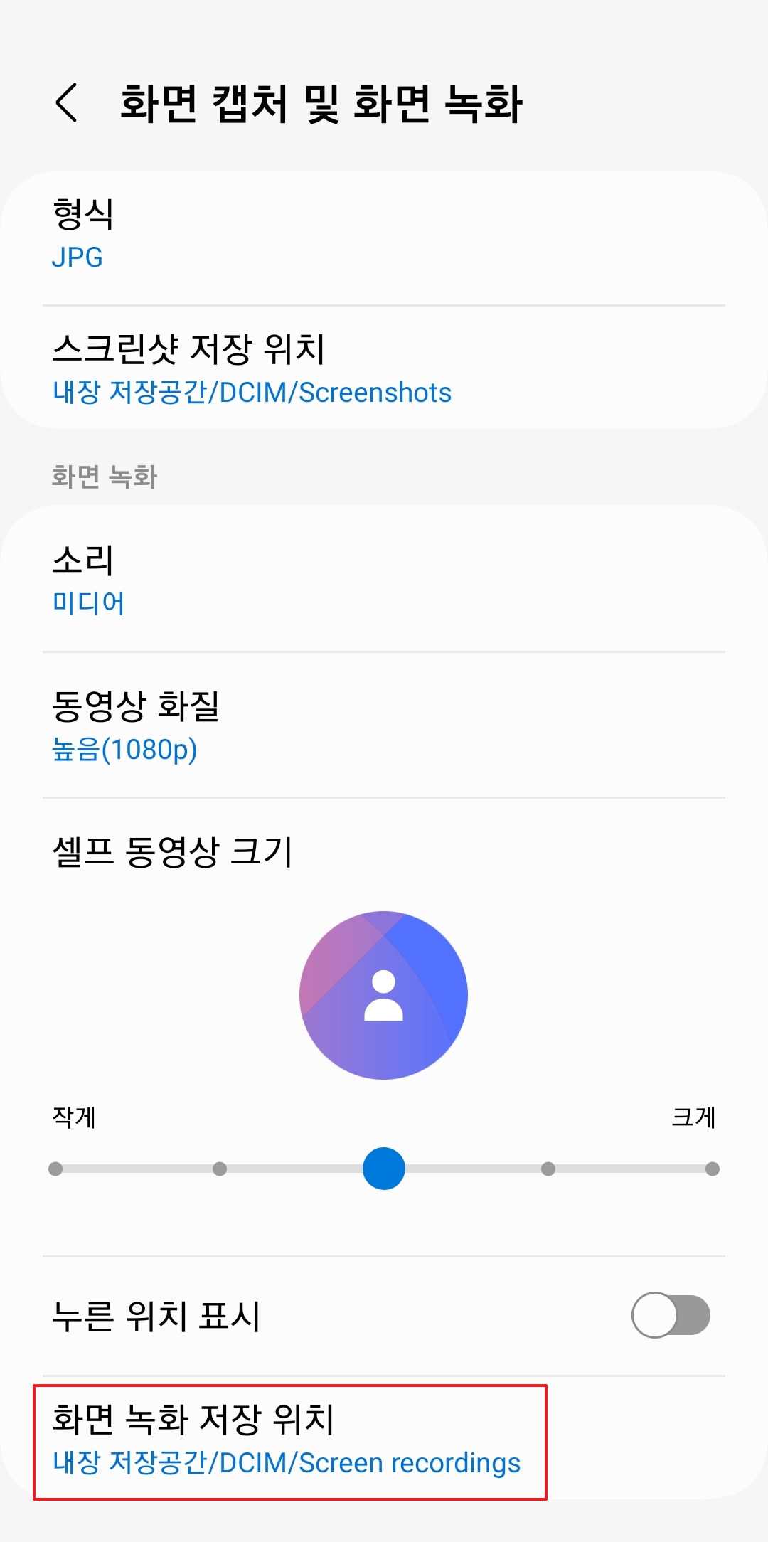 {"alt":"화면 녹화 화질, 셀프 동영상 크기, 저장 위치 등 세부 설정 화면"} 댓글