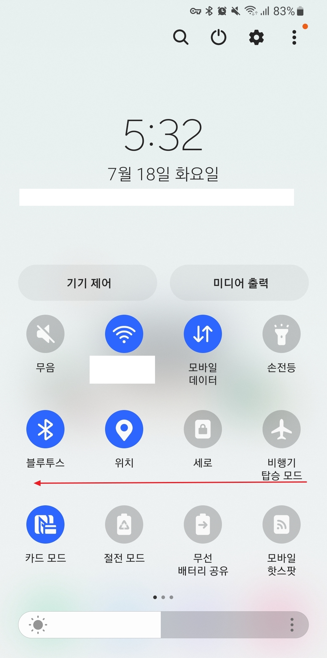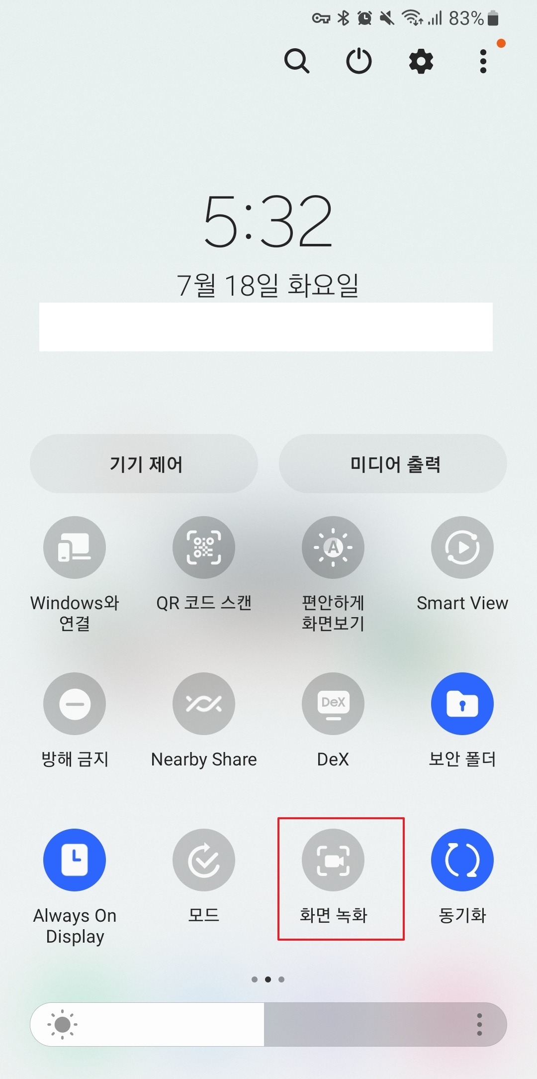한 번 내린 빠른 설정 창을 다시 한번 아래로 쓸어내리면 숨겨져 있던 더 많은 기능 아이콘들이 나타납니다. 이렇게 창을 완전히 펼쳐야 화면 녹화 기능을 비롯한 모든 설정 버튼을 한눈에 확인할 수 있습니다.