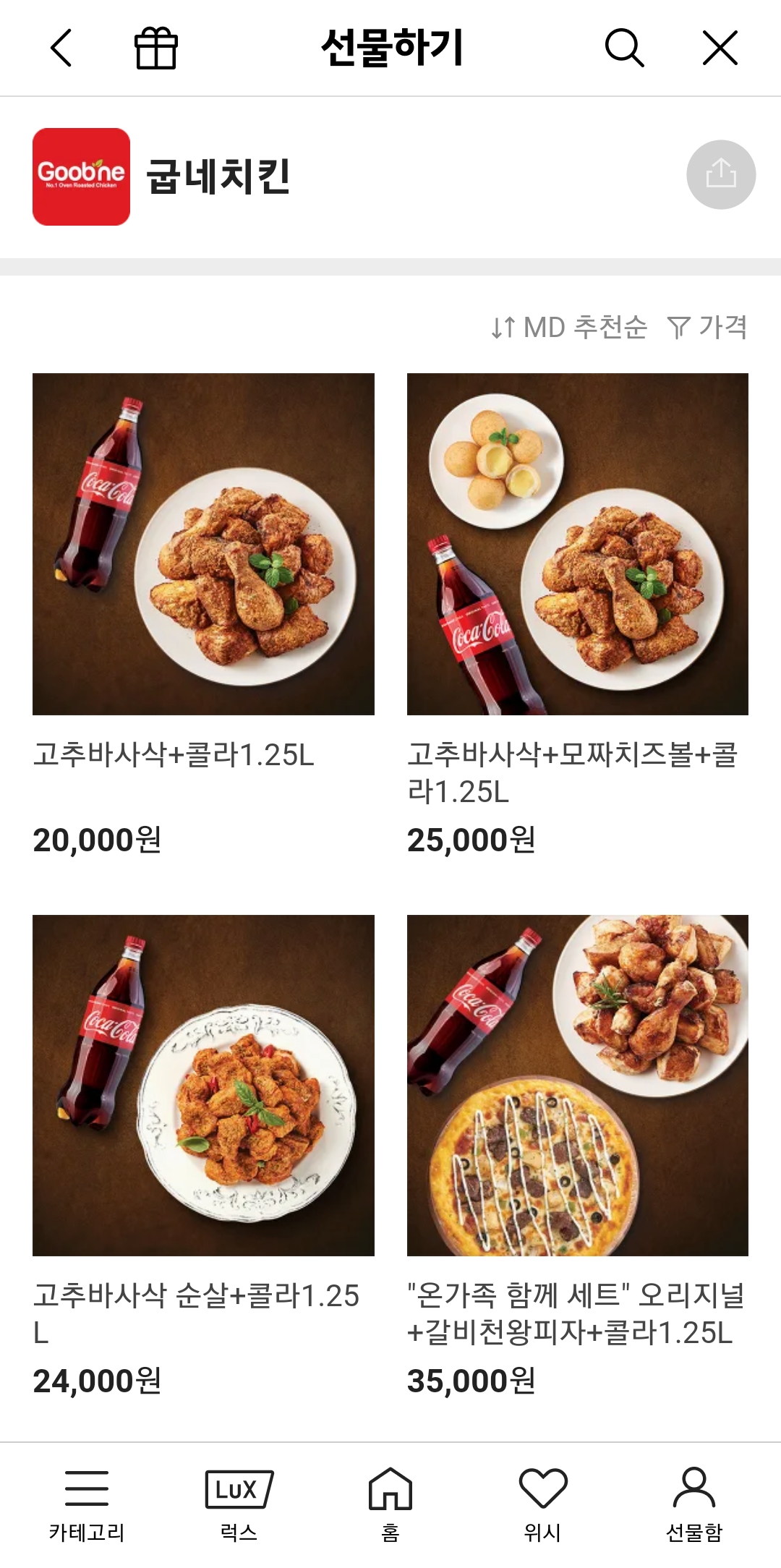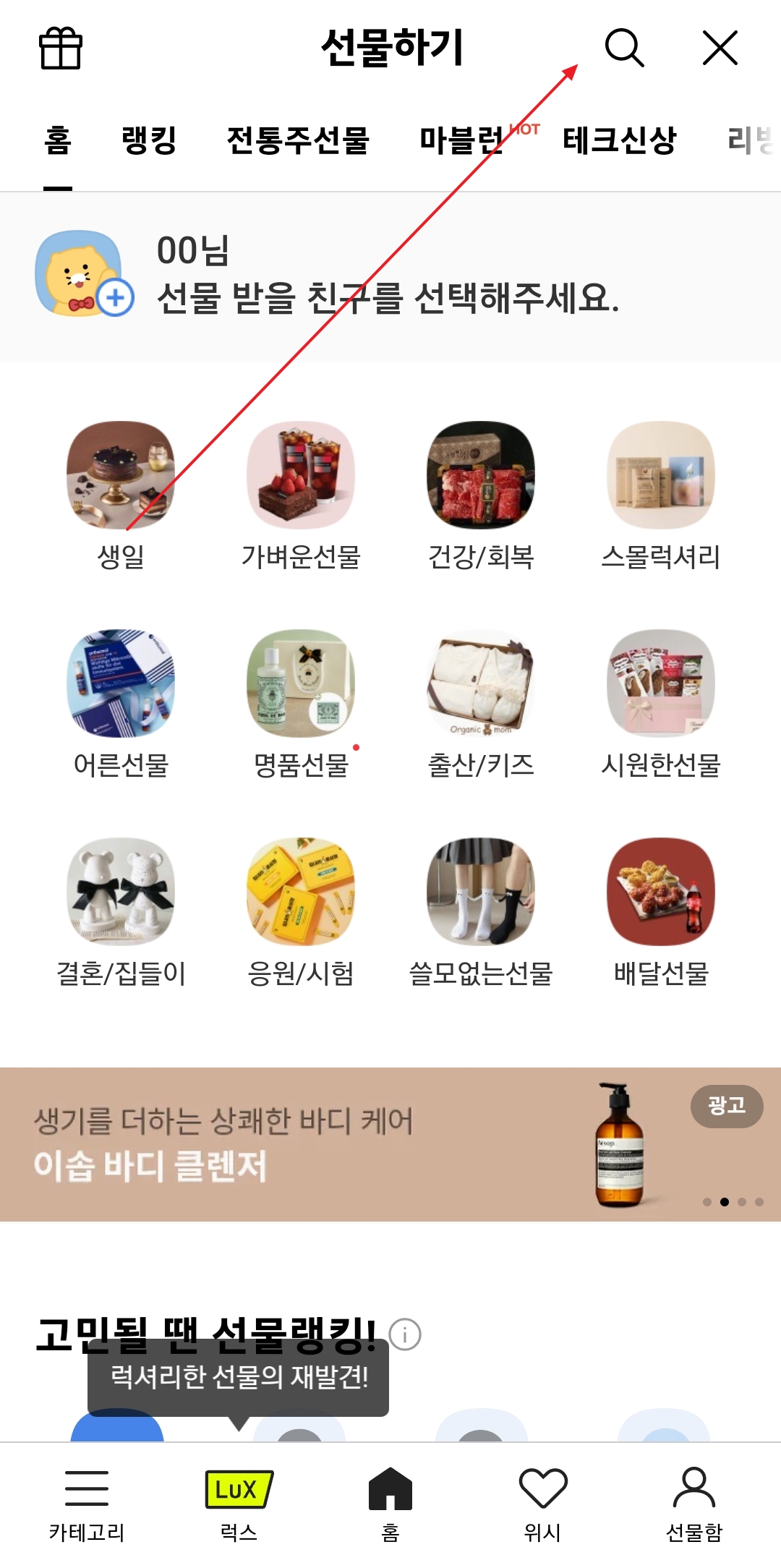 화면 중앙에 보이는 '선물하기' 아이콘을 찾아 눌러주시면, 선물을 고를 수 있는 전용 페이지로 바로 이동하게 됩니다. 여기서부터 본격적인 선물 고르기가 시작됩니다.
