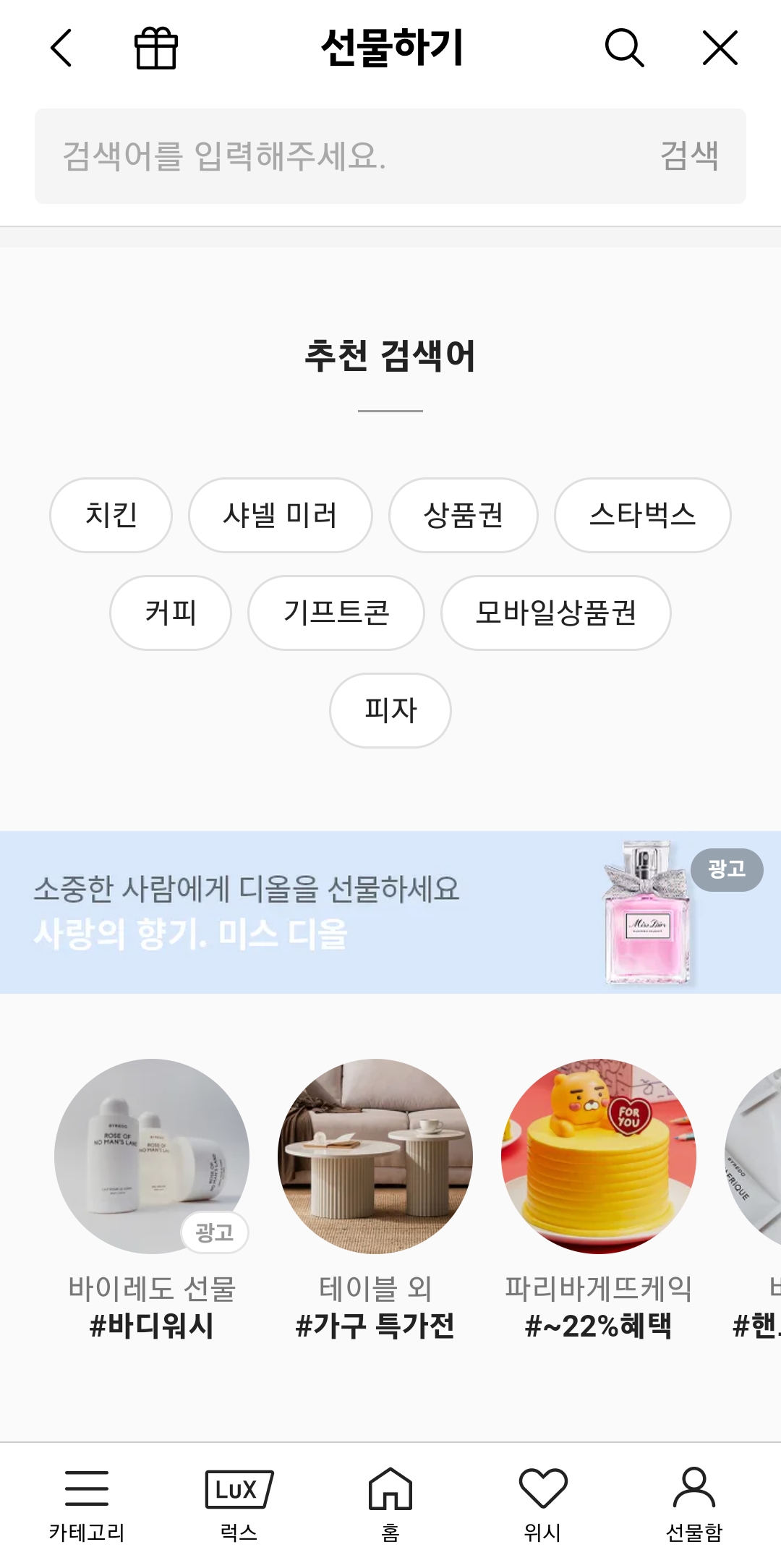 선물하기 페이지에 들어오면 생일, 가벼운 선물 등 다양한 테마별 추천 상품이 나타납니다. 화면 상단의 검색창을 이용해 특정 브랜드를 찾거나, 카테고리를 둘러보며 선물을 고를 수도 있습니다.
