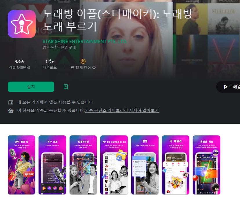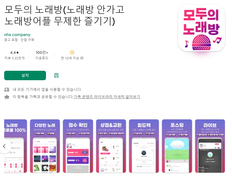 검색 결과 화면에서는 다양한 노래방 앱들을 한눈에 볼 수 있습니다. 앱 아이콘과 이름, 별점 평가, 그리고 설치 횟수 같은 정보를 통해 어떤 앱이 인기가 많은지 쉽게 파악할 수 있습니다. 여러 앱이 각기 다른 특징을 가지고 있으니 설명을 잘 읽어보는 것이 중요합니다.