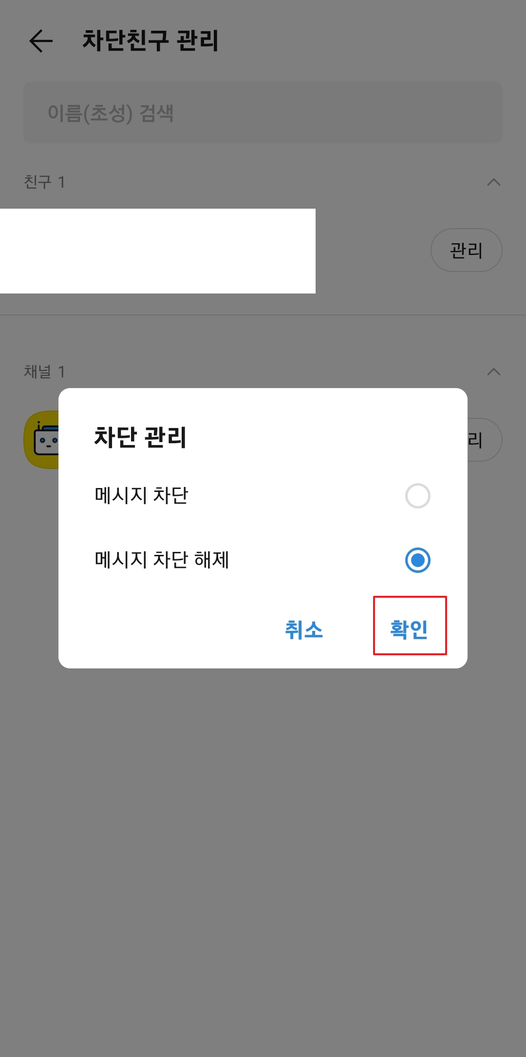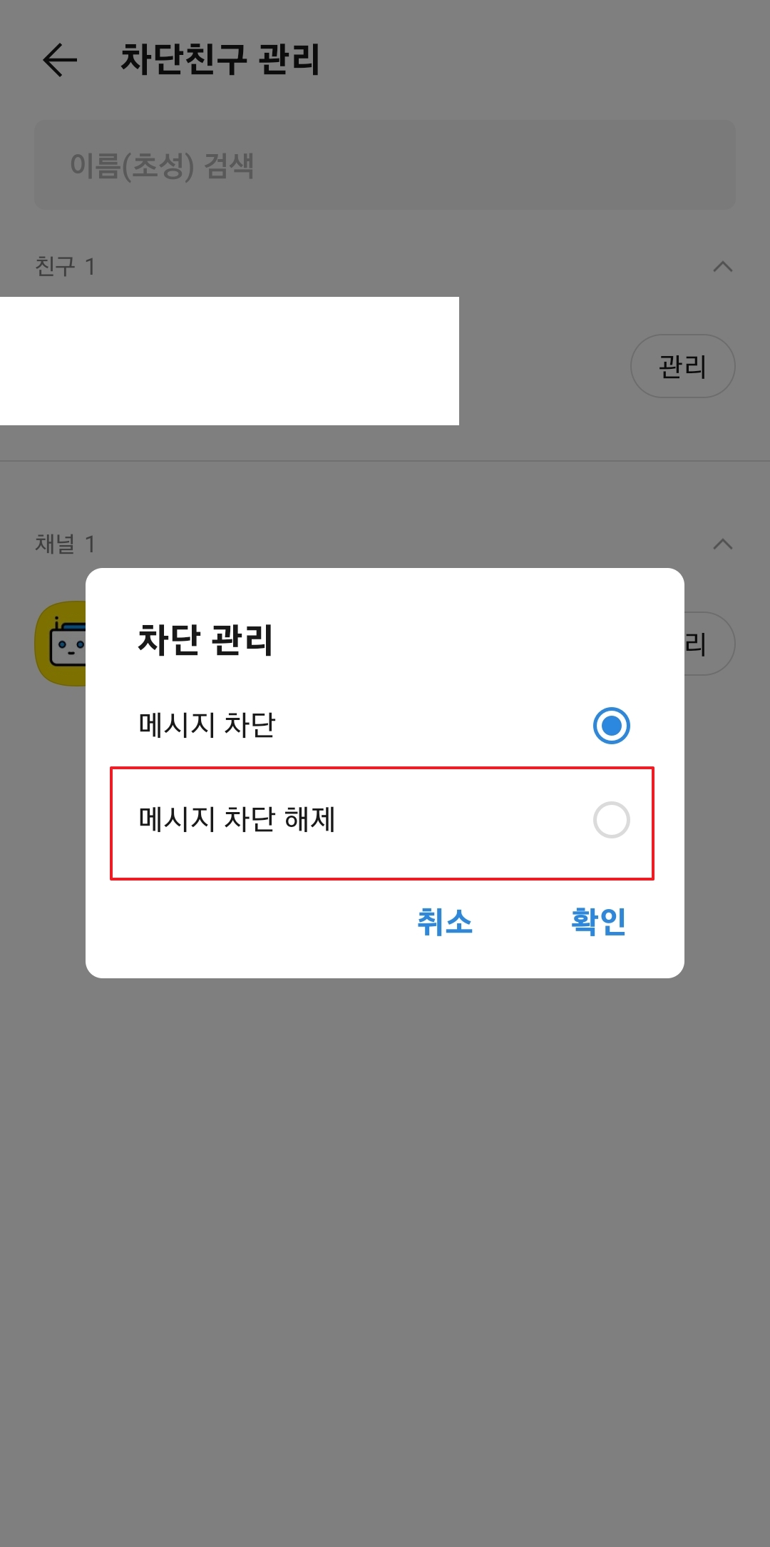 '관리' 버튼을 누르면 작은 팝업창이 나타나며 '메시지 차단' 또는 '차단 해제'를 선택할 수 있습니다. 여기서 '차단 해제'를 선택해야 채널이 목록에서 완전히 사라지게 됩니다. 조금 헷갈릴 수 있지만, 삭제를 위해서는 차단을 해제하는 과정이 필요합니다.