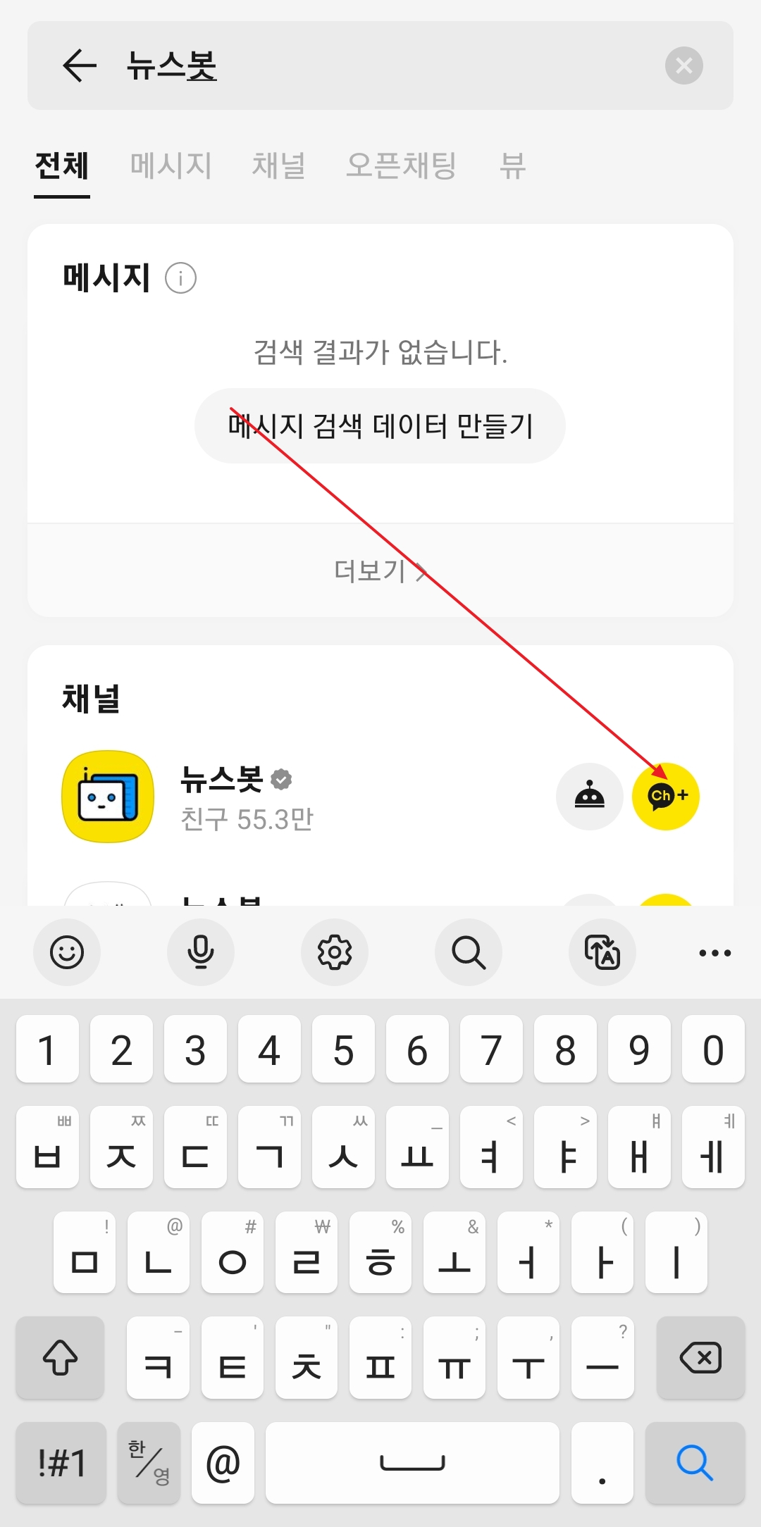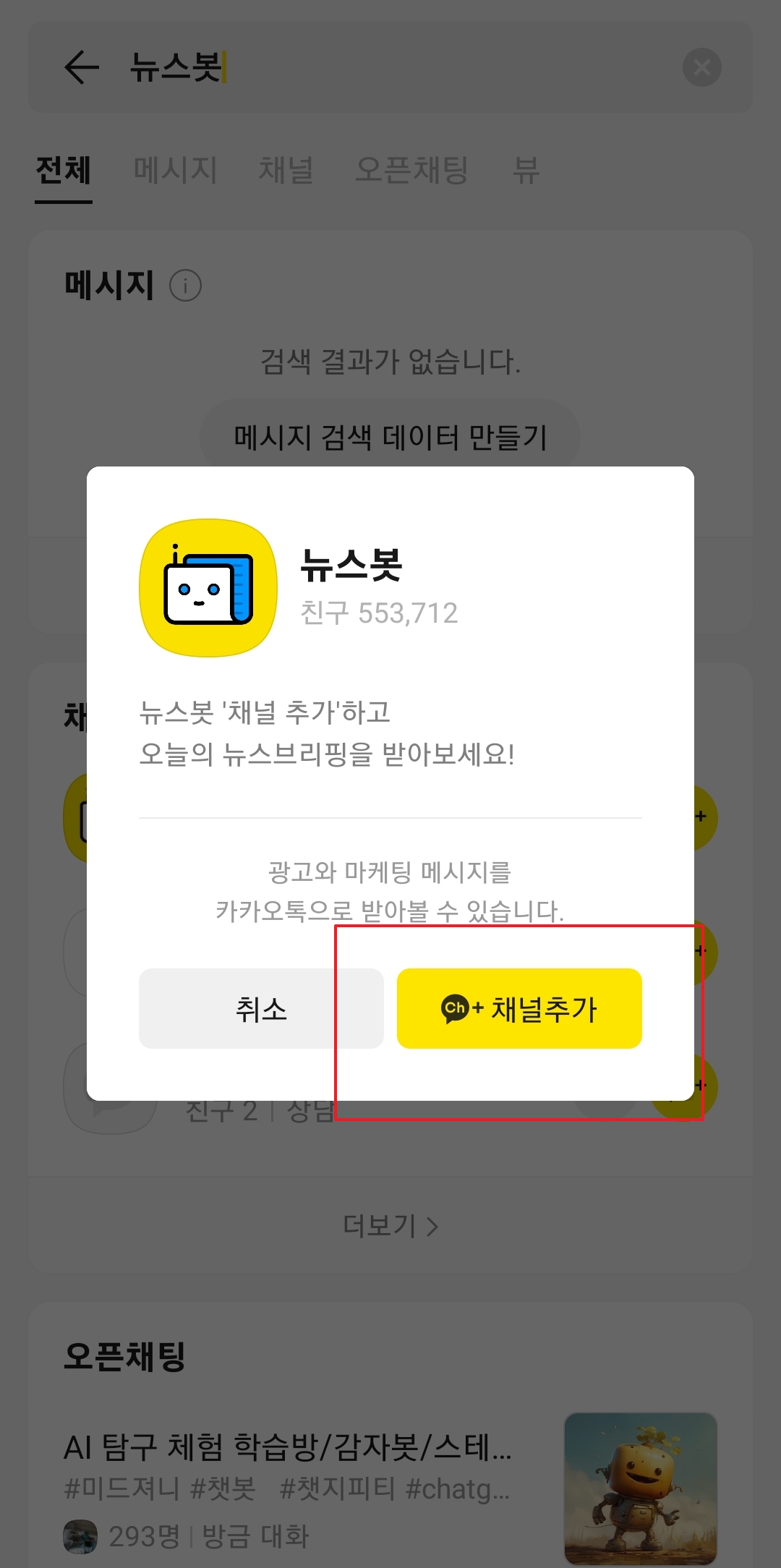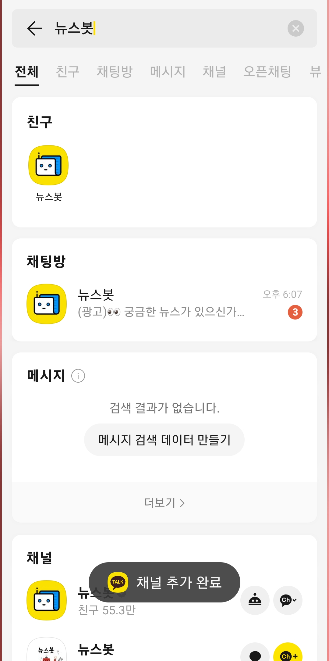 검색창이 나타나면 '뉴스봇'이라고 입력합니다. 그러면 관련 채널이 목록에 나타나는데, 여기서 우리가 차단하려는 'Daum 뉴스' 채널을 선택하면 됩니다. 정확한 채널을 선택해야 원치 않는 알림을 막을 수 있습니다.