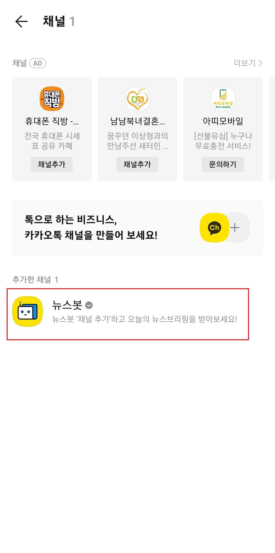 채널이 추가되면 홈 화면으로 돌아와 하단의 친구 목록 아이콘을 누릅니다. 그다음 상단 메뉴에서 '채널'을 선택하면, 방금 추가한 뉴스봇 채널을 포함한 모든 채널 목록을 확인할 수 있습니다.