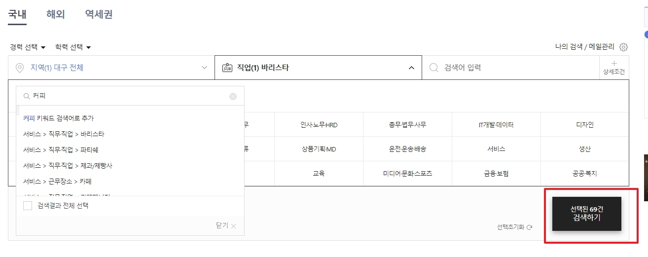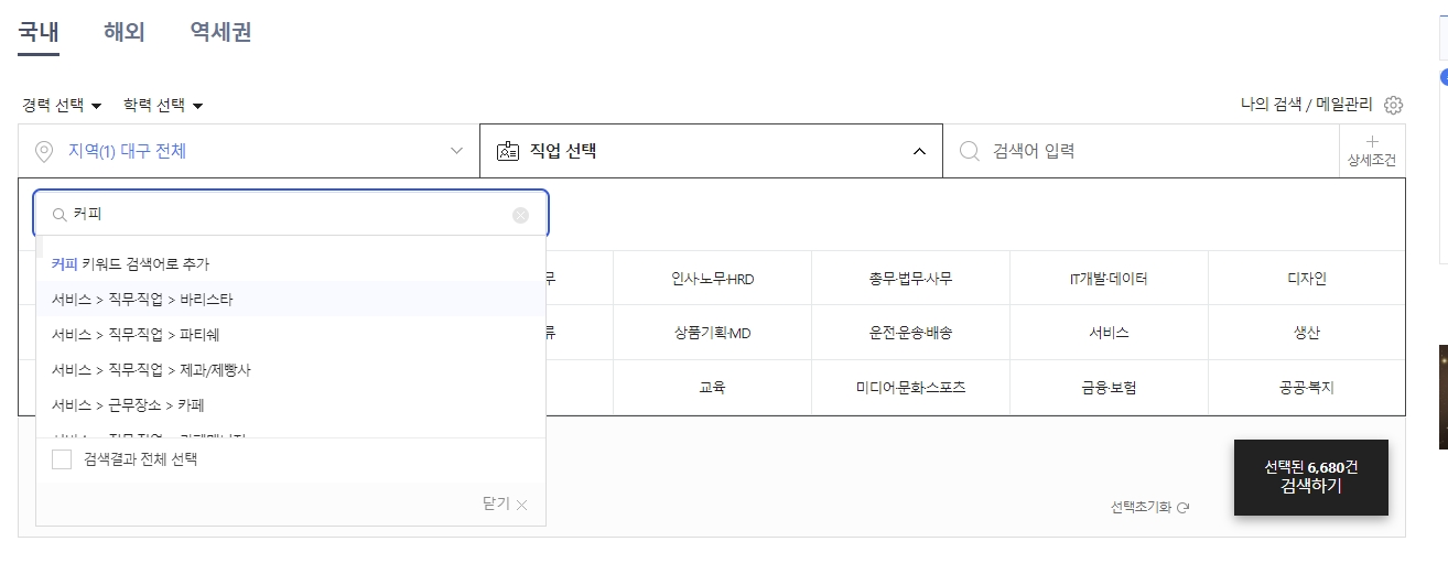 '커피'를 검색하니 관련 직종인 '바리스타'가 결과로 나타났습니다. 이제 이 '바리스타' 항목을 체크하고 아래의 '선택 완료' 버튼을 누르면, 대구 지역의 바리스타 채용 공고만 정확하게 골라볼 수 있습니다.