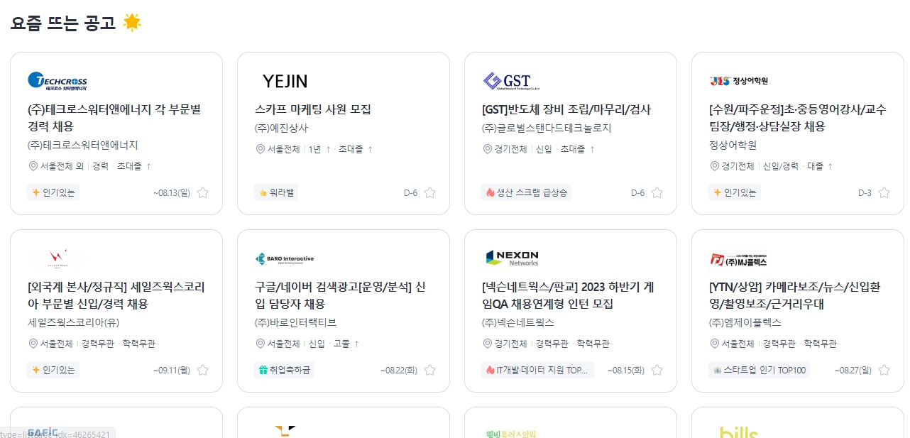 가장 먼저, 채용 정보 검색을 위해 사람인 공식 사이트로 들어갑니다. 이곳에서 사람인 대구 지역의 모든 채용 공고를 확인할 수 있습니다. 메인 화면에는 다양한 메뉴와 채용 정보들이 있지만, 우리는 지역별로 일자리를 찾아볼 예정입니다.