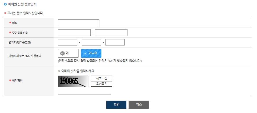 비회원으로 신청하기를 누르면 개인정보 수집 동의와 같은 간단한 본인 확인 절차를 거치게 됩니다. 안내에 따라 필요한 정보를 입력하고 다음 단계로 넘어가면, 드디어 신청서를 작성하는 화면이 나옵니다.