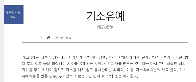 2. 기소유예를 검색합니다. 검색 결과로 기소유예의 정의와 개념이 표시되며, 이는 검사가 형사 사건에서 공소를 제기하지 않고 피의자에게 유예 처분을 내리는 제도를 의미합니다. 기소유예는 범죄가 인정되지만 범인의 연령, 환경, 성행, 피해자와의 관계, 범행의 동기 및 후속 정황 등을 종합적으로 고려하여 다시 한 번 재기의 기회를 주기 위해 적용됩니다.