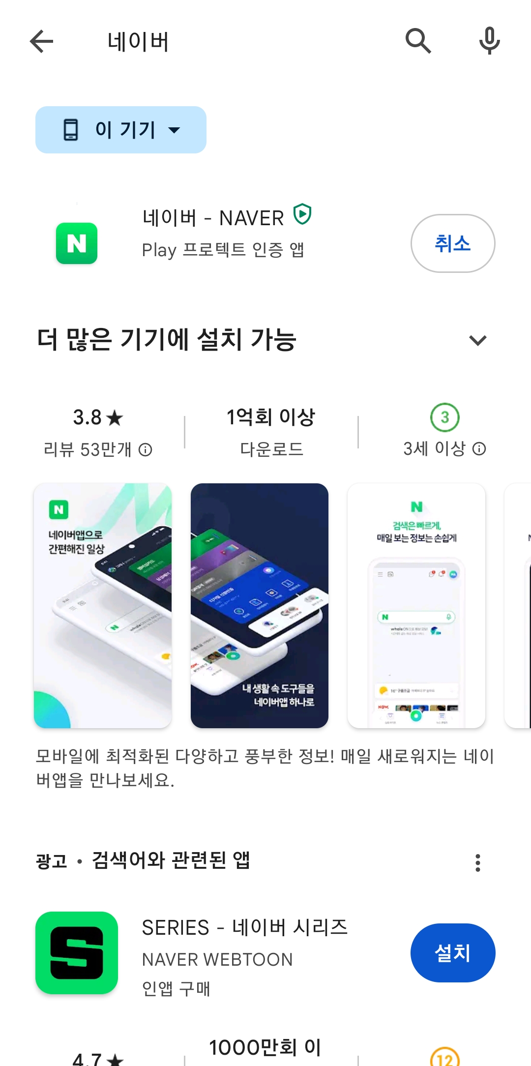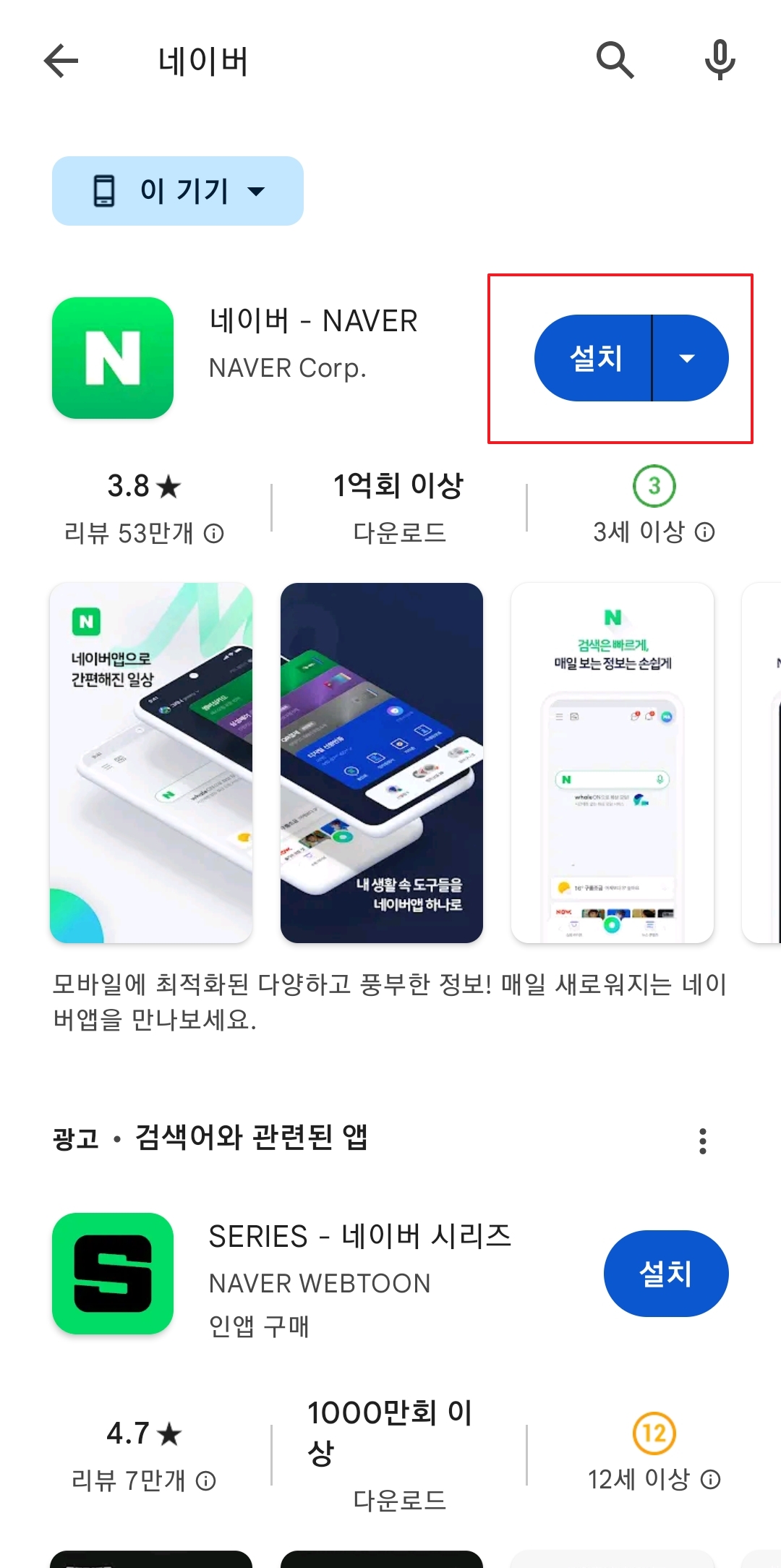 검색창에 '네이버'라고 입력하고 검색 버튼을 누르면, 초록색 N 아이콘이 보일 거예요. 그걸 확인하고 '설치'를 눌러주세요. 데이터 환경에 따라 시간이 조금 걸릴 수 있는데, 금방 설치가 완료되더라고요.